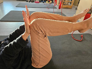 바로 누운 자세에서 무릎과 고관절을 90도 각도로 구부린다. 그리고 양손은 무릎을 잡아라. 다리는 머리 방향으로 들어 올리면서 밀고, 가지고 양손은 다리를 막을 것이다. 겉으로 보기엔 전혀 움직임이 없다. 하지만 손과 발이 반대 방향으로 힘을 주고 있기 때문에 몸 전체에 힘이 들어갈 것이다. 이 동작은 골반과 체간의 안정화에 기여한다. 팔에 힘을 줄 때 승모근에 힘이 들어가는지 체크하자. 어깨가 으쓱 올라가 있다면 정렬을 다시 잡아야 하며, 어깨선의 변화는 없어야 한다. 멈춘 자세에서 호흡만 해보자. 호흡을 크게 마실 때 내 배가 볼록하게 부풀어 오르고 호흡을 내쉴 때 배꼽이 바닥에 닿는다는 느낌이 들면 제대로 된 동작을 하고 있는 것이다. 이 동작은 호흡이 가장 중요하다. 호흡을 최대한 깊게 들이쉰다. 하지만 호흡을 내쉴 때 입을 닫고 치아 사이로 공기를 길게 내보내라. 호흡을 뱉는 시간을 30초 이상 유지하자. 아침저녁으로 하루 10분만 투자한다면 운동이 가능하다. 운동을 진행한 후 즉시 걸어보자. 안정화 운동을 했을 때 체간의 수축감을 느끼면서 걷는다. 배꼽을 안으로 넣는다는 느낌 또는 항문에 힘을 주어 체간을 단단하게 만든다는 느낌이 든다면 쉽게 알 수 있을 것이다. 뚜렷한 변화는 느껴지지 않을 것이다. 하지만 보행 시 이전보다 안정감을 느낄 수 있고, 통증이 있는 사람이라면 통증의 강도가 줄어들 것이다.