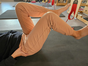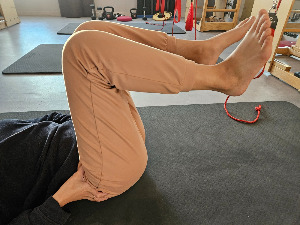 이전 동작의 골반운동에서는 움직임이 없이 진행되었다면 이번에는 안정화된 체간과 골반을 기반으로 하체의 동작을 만들어 볼 것이다. 실행했다면 동일 자세에서 손의 위치를 골반 앞에 제일 튀어나와 있는 뼈인 ASIS로 바꾼다. 그리고 복부를 납작하게 누른다는 느낌으로 힘을 주고 한발씩 발이 바닥에 닿기 전까지 이동한 후 다시 돌아오자. 골반의 ASIS는 절대 움직이면 안 된다. 만약 움직인다면 움직이기 전까지 다리를 이동한 후 버티면서 복부의 긴장감을 유지해 보라. 그리고 천천히 가동 범위를 늘려나간다. 한발씩 교대로 운동을 진행한다. 양발 모두 골반의 움직임이 없이 잘 움직여진다면 양발을 동시에 움직여보자.