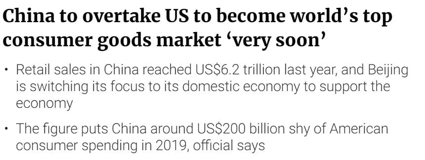 중국국가발전위원 및 경제국의 관료들은 2020년 이미 중국의 소비총액은 6조 달러로, 미국의 소비총액과의 차이가 2000억 달러로 좁혀졌으며 팬대믹 상황 속 추월은 시간 문제라고 말합니다. 실제로, 2020년 중국의 소비총액은 동년대비 약 15% 상승한 약 6조 달러로 이중 절반인 54.3%가 국내 소비라고 하니, 대륙안에서 얼마나 치열한 경쟁이 벌어지는지 가히 상상이 안갑니다.