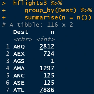 group_by 와 summarise는 항상 같이 같이 쓰입니다. 위의 count와 같은 결과 값을 가지지만,