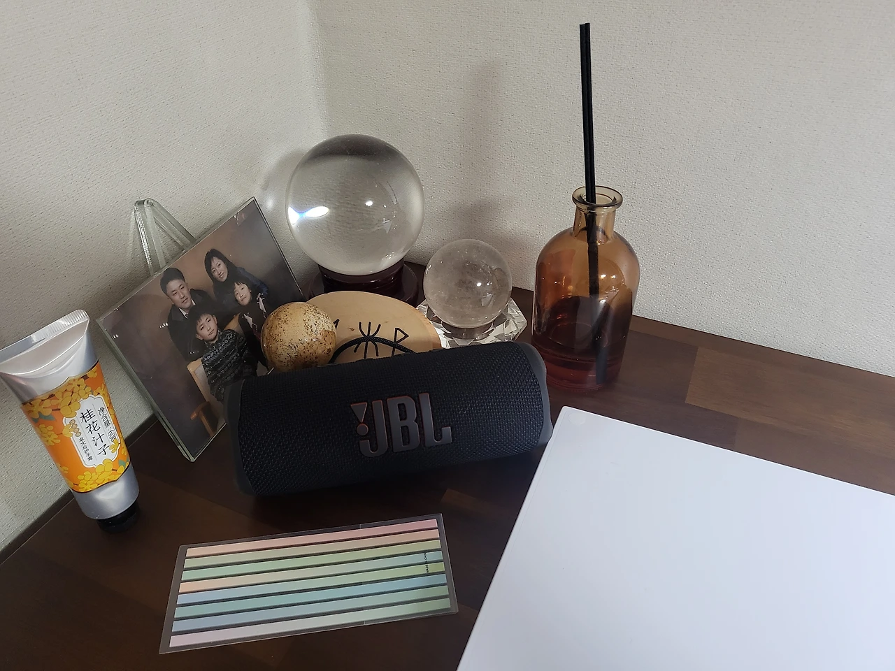 안방의 가구를 거실로 옮기고 빈 공간에 새 책상을 들였습니다. 아카시아 원목으로 만든 책상과 의자는 공간에 딱 맞았고, 은은한 나무 향까지 퍼져 기분이 좋아졌어요. 책상 위에는 제가 좋아하는 것들만 올려두었습니다. 수정구 두 개, 원석 볼, 가족사진, 블루투스 스피커, 디퓨저, 룬 문자, 그리고 아름다운 나의 노트북!