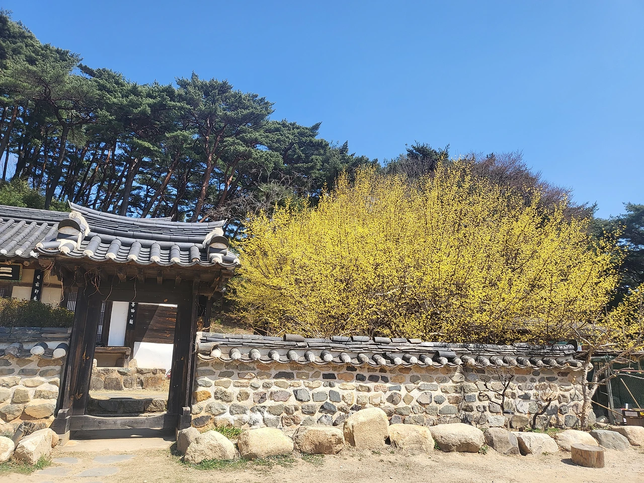 통도사에 온 김에 극락암으로 향했다. 노란 산수유가 담장 너머로 반기듯 피어 있었다. 홍매화만 봄꽃이냐는 듯 노란빛을 한껏 자랑하고 있었다. 극락암 주변을 거닐다 보니 작지만 소담스러운 홍매화 한그루가 피어 있었다.