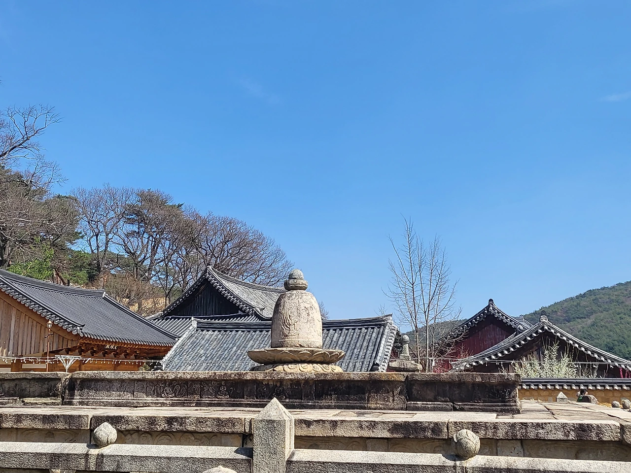 대웅전 쪽으로 가보니 금강계단 앞에 사람들이 몰려 있었다. 올 때마다 막혀 있어 들어가 보지 못했는데, 오늘이 음력 24일 관음재일이라 사리탑 문이 열려 있었다. 신발을 벗고 조심스레 들어가 탑을 세 번 돌았다. 이런 운 좋은 날, 사진 한 장 남겨야지 싶어 휴대폰을 꺼내 찰칵. 그 순간 멀리서 한 보살님이 소리쳤다.