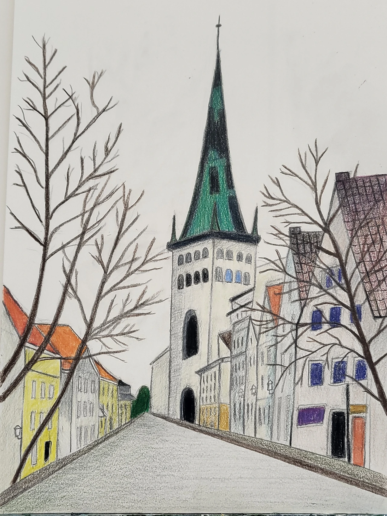 화실에 도착해 스케치를 하고, 색연필로 그림을 그렸다.