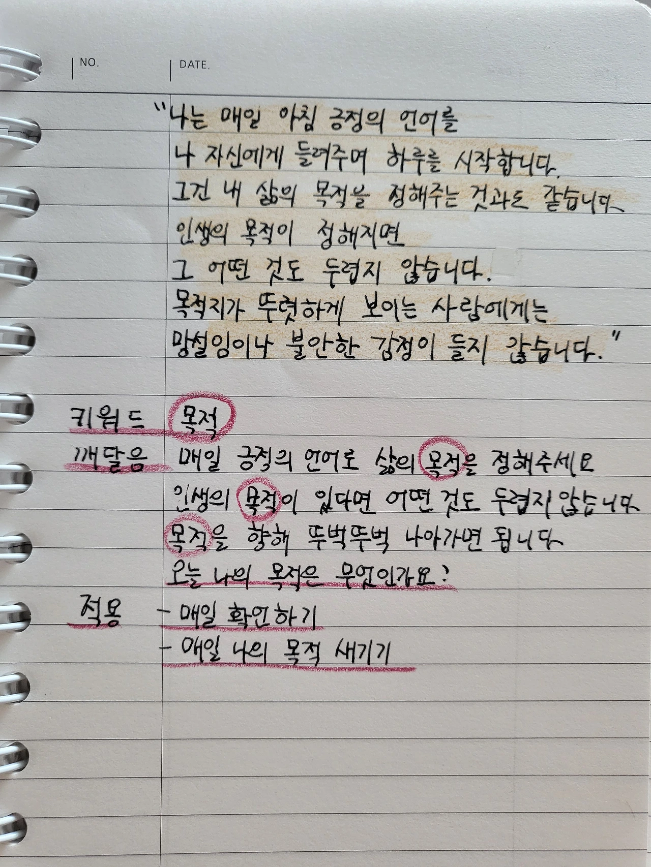 우리는 매일 저녁 잠들며 작은 죽음을 맞이하고, 아침이 되면 다시 태어납니다. 오늘은 어떤 하루를 살고 싶나요? 매일 아침, 이루고 싶은 하루를 긍정의 언어로 자신에게 들려주세요. 그것은 하루의 목적을 정하는 일입니다. 목적이 분명해지면, 어떤 상황도 두렵지 않습니다. 정해진 방향을 향해 한 걸음씩 걸어가면 되니까요.