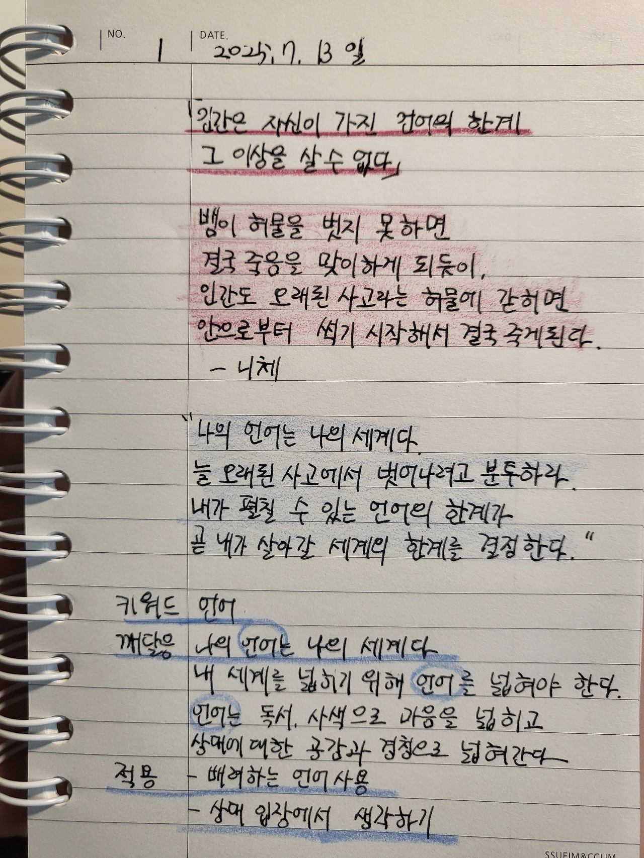 내가 어떤 언어로 세상을 표현하느냐에 따라 내 눈앞에 펼쳐지는 세상도 달라집니다. 내가 가진 언어의 폭이 내가 살아갈 수 있는 세계의 크기를 정합니다.