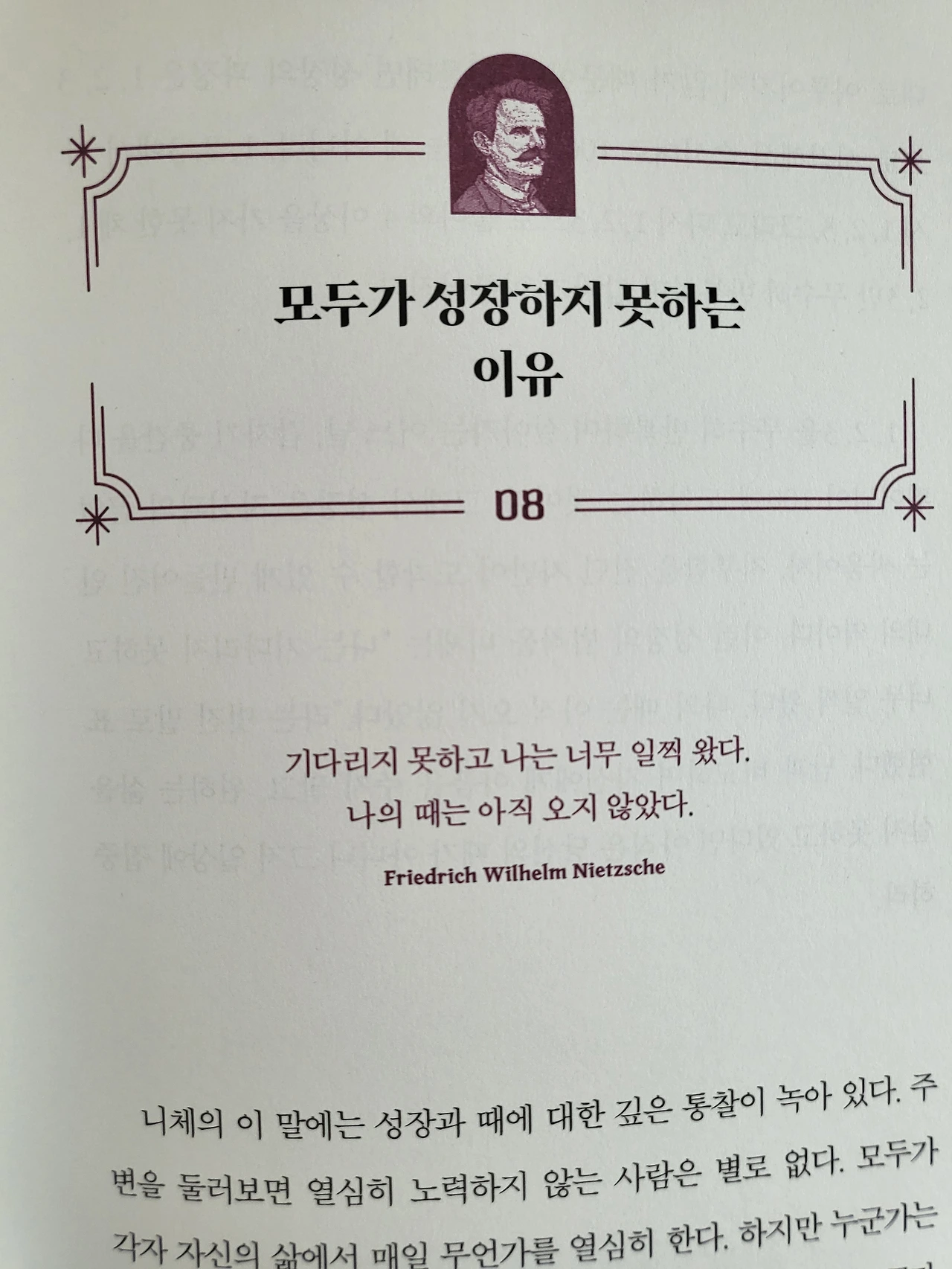중요한 건 지루함 속에서도 포기하지 않고 반복하며, 묵묵히 자신을 다듬어가는 것입니다. 철학자 니체는 말합니다. "나의 때는 아직 오지 않았다." 남과 비교하며 조급해하지 말고, 상처받지 말고, 아직은 때가 아니라고 스스로를 다독이며 지금, 이 순간에 집중하라고요.