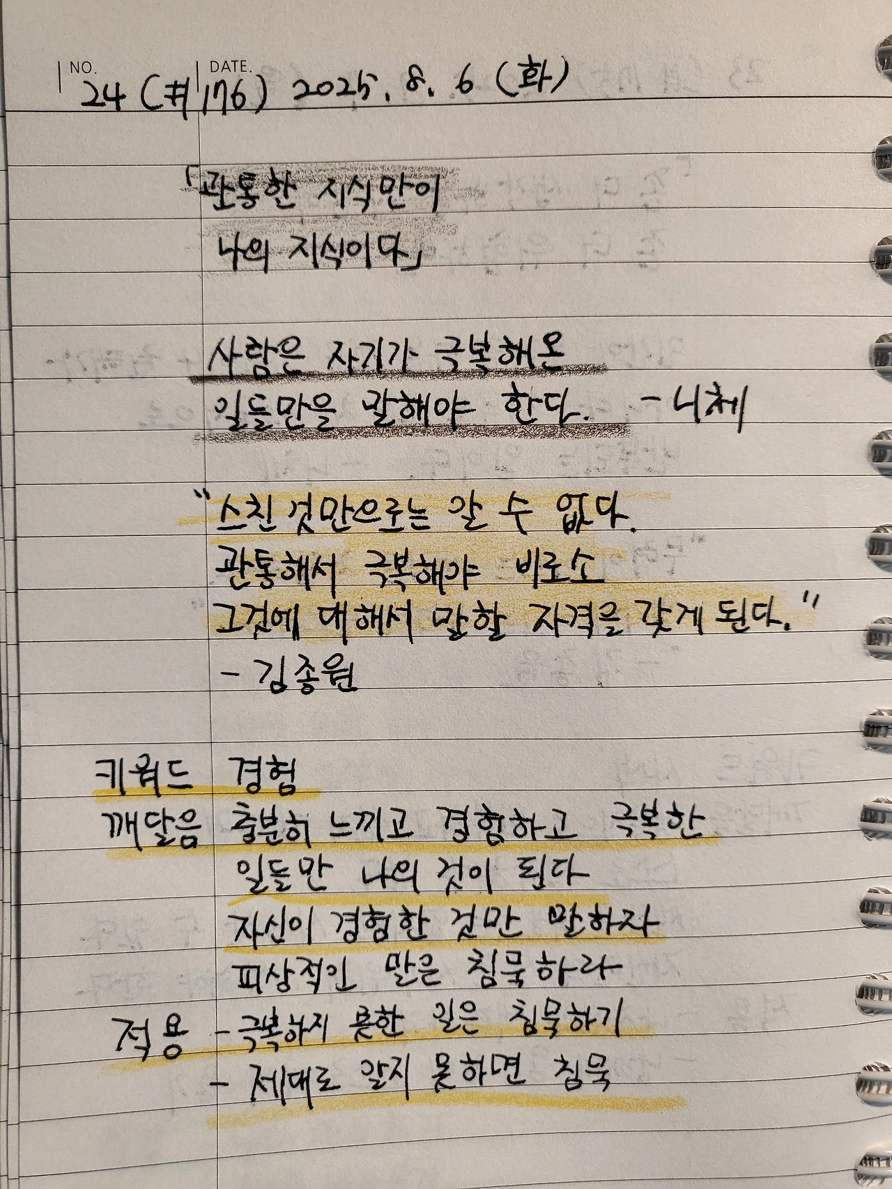 사람은 자신이 직접 경험하고, 그 과정을 통해 극복해 낸 일에 대해서만 말해야 합니다. 제대로 겪어보지 않은 일이라면, 침묵하는 것이 오히려 더 진실한 태도입니다. 경험하지 않고 무언가를 말하기 시작하면, 그 일을 온전히 겪어볼 기회조차 잃게 되니까요.