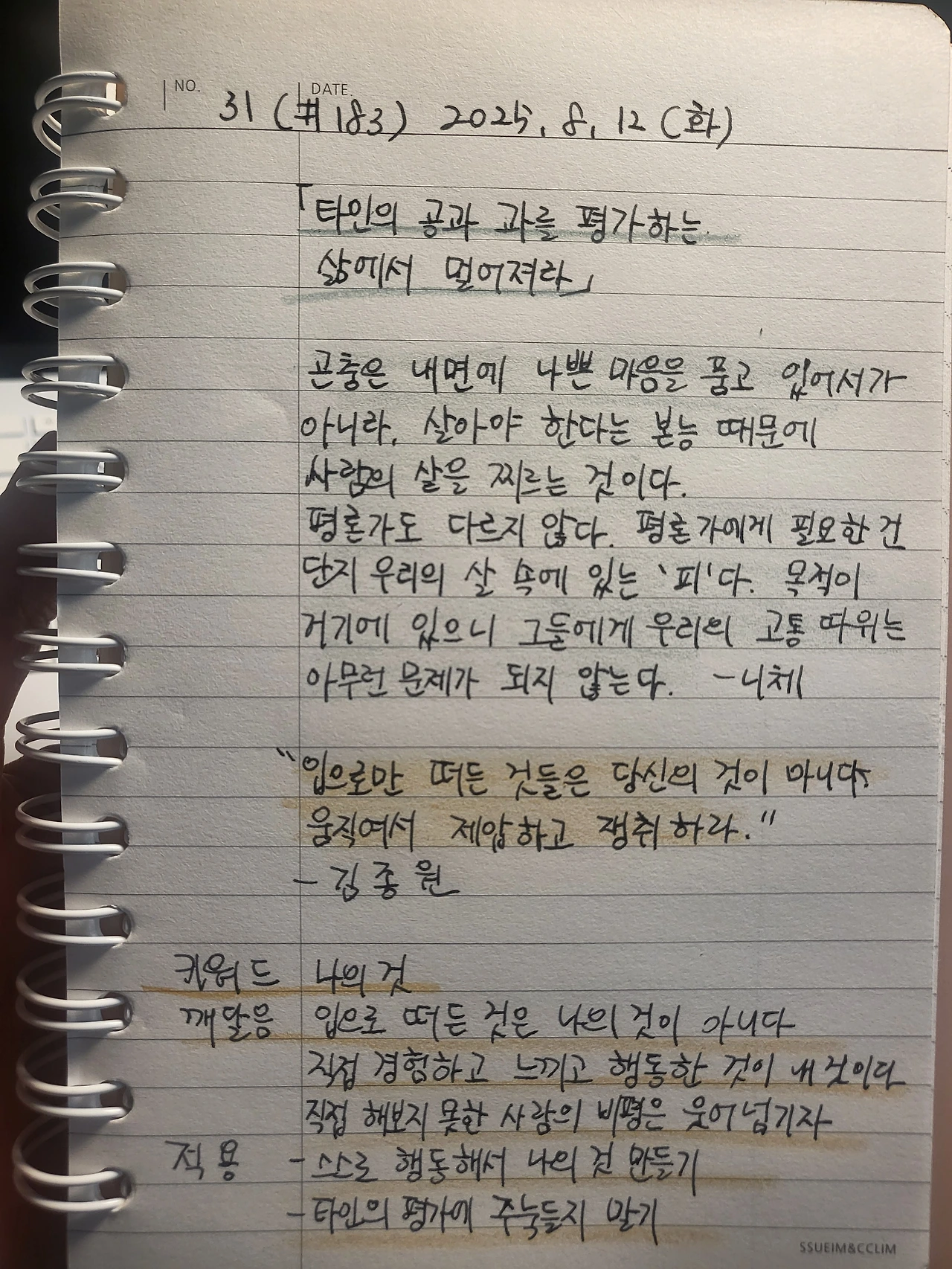 평가는 더 나은 방향을 찾는 데 꼭 필요한 과정입니다. 그보다 더 중요한 것은, 남을 평가하기 전에 내 손과 발을 써서 무언가를 해보는 것입니다. 직접 시도하고, 실패하고, 다시 일어서며 느끼는 감정은 남을 지켜보며 얻는 것과는 차원이 다릅니다.