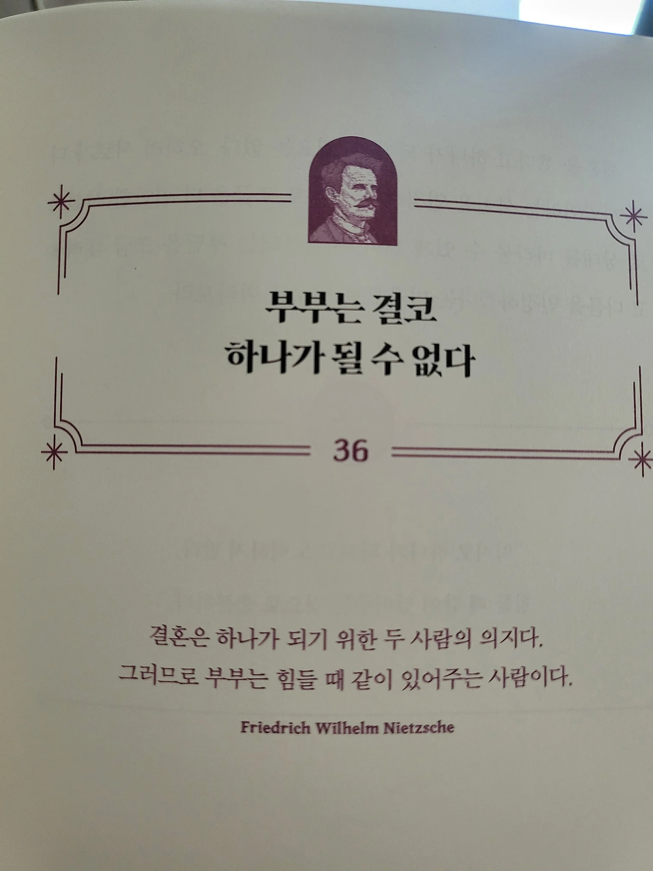 많은 부부가 자주 다투는 이유는 억지로 하나가 되려 하기 때문입니다. 니체는 부부란 의지를 가지고 함께 고통을 견디고 슬픔을 나누는 동반자라고 합니다. 서로 다른 두 사람이 모든 것을 하나로 만들려 하면 갈등이 일어날 수밖에 없습니다. 서로의 다름을 인정하고 이해하는데서 평화가 찾아옵니다.