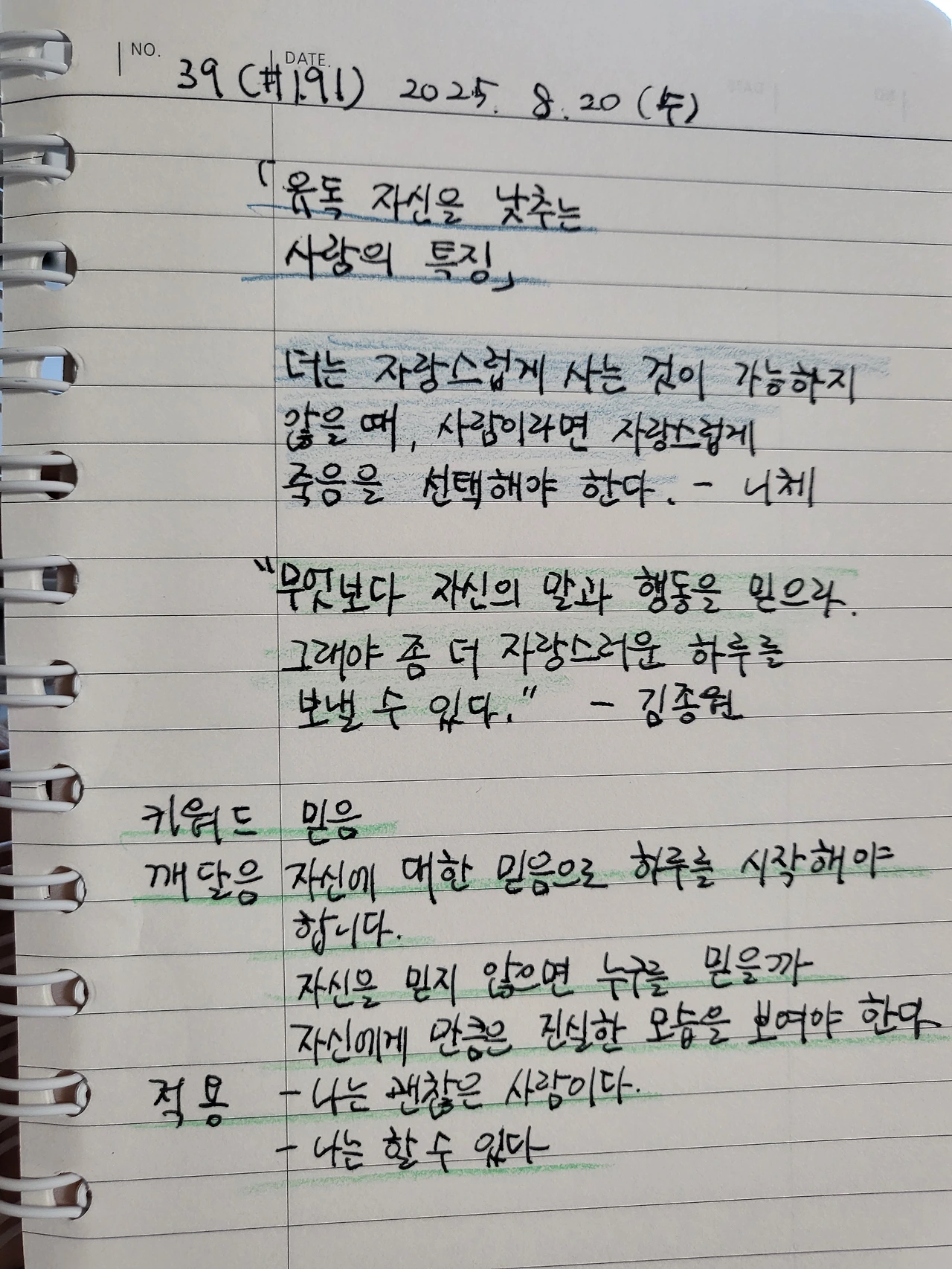 무엇보다 중요한 것은 자신을 믿는 일입니다. 스스로에게 한 약속을 지킬 수 있을 때, 우리는 조금 더 자랑스러운 삶을 살 수 있습니다.