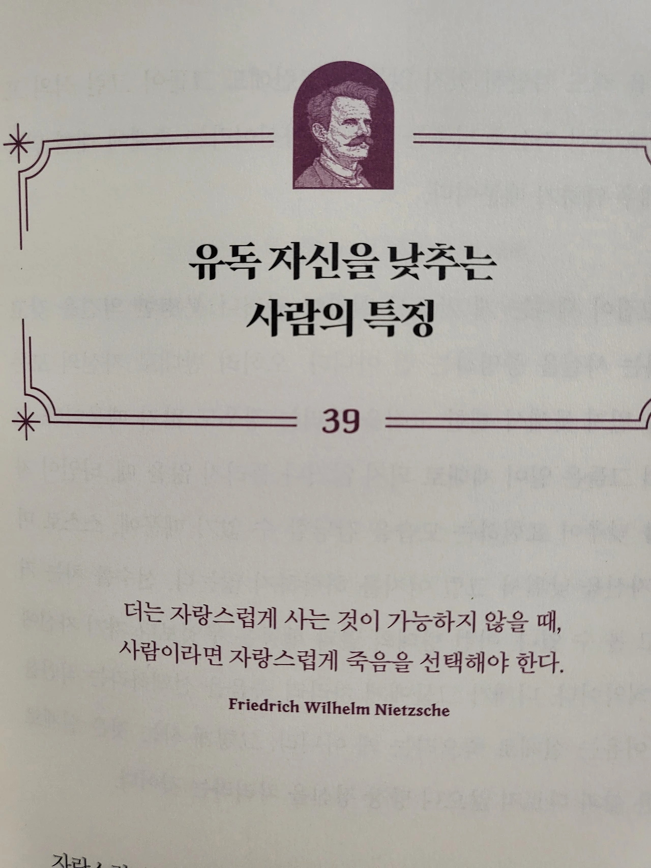 자랑스럽게 살 수 없다면 죽음을 택하라는 니체의 말은 너무 가혹하지요. 그 말속에는 ‘자신에게 떳떳하고 자랑스러운 삶을 살아라’는 강한 메시지가 담겨 있다고 생각합니다. 매일 자신의 말과 행동을 믿고 지켜 나갈 때, 자랑스러운 하루하루가 쌓여가는 것입니다.