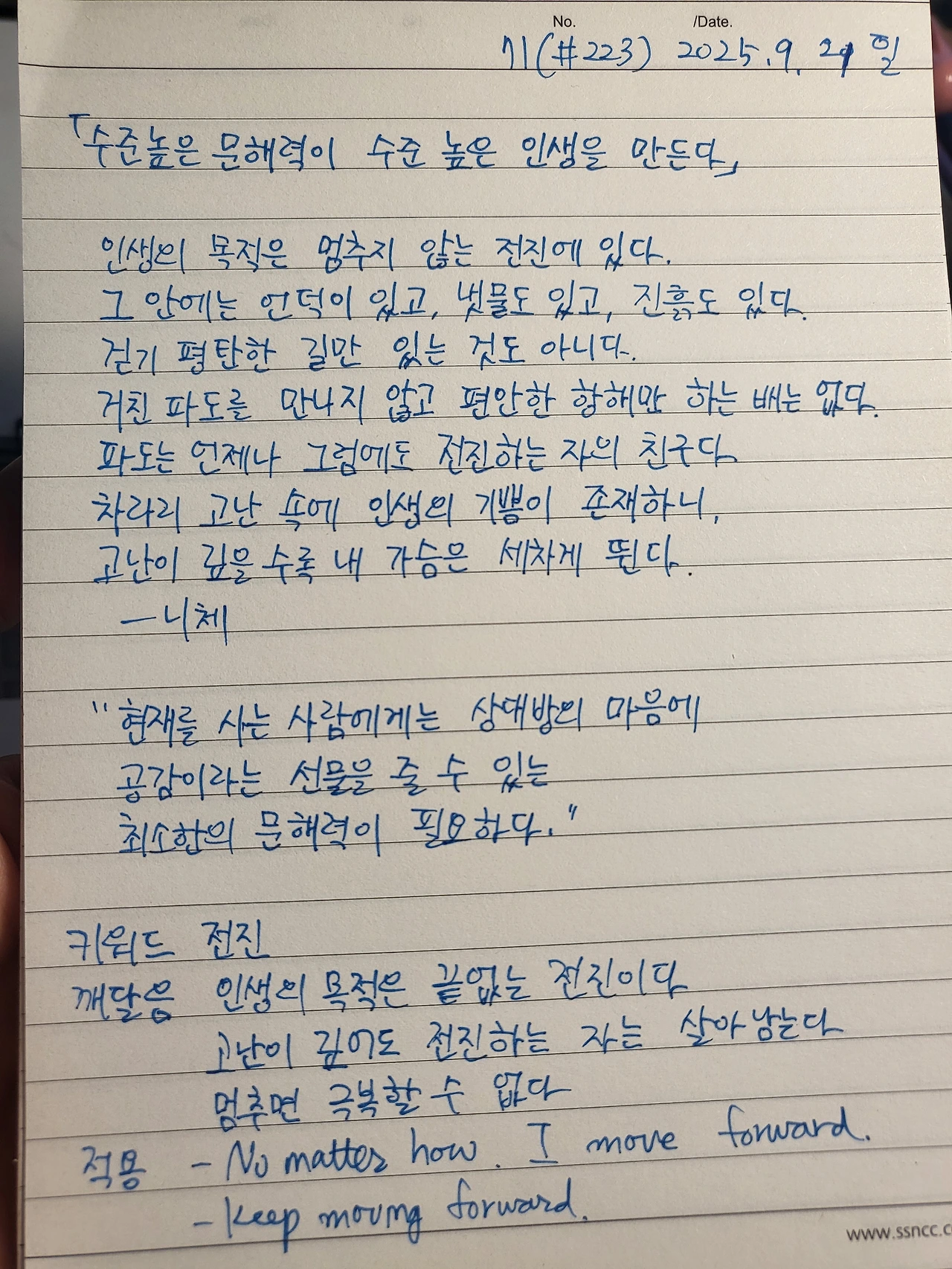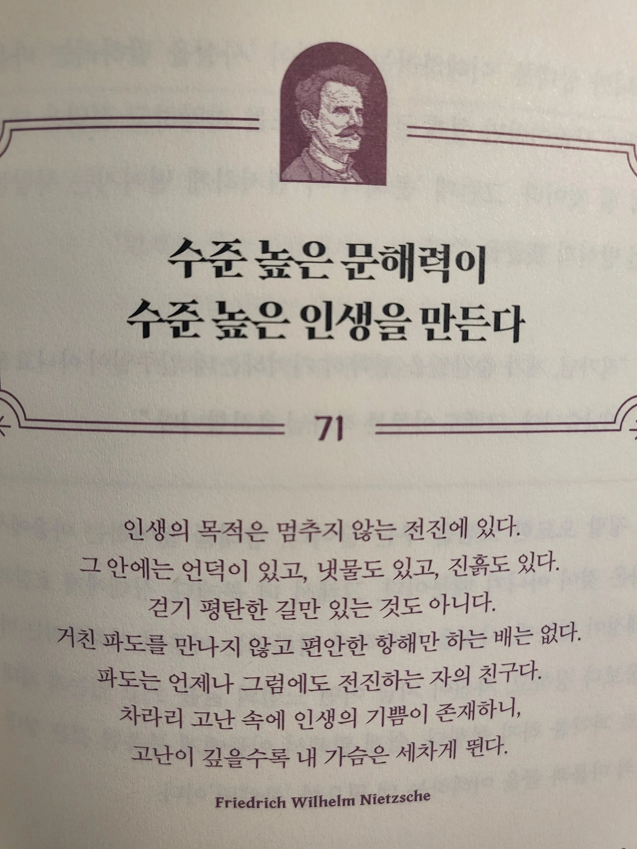 인생의 목적은 멈추지 않는 전진에 있습니다. 그 길 위에는 부드러운 풀밭만 있는 것이 아니라, 언덕도 있고, 냇물도 있으며, 진흙도 있습니다. 길은 언제나 곧지 않고, 항해 또한 늘 잔잔하지 않습니다. 거친 파도를 만나지 않는 배는 없지요. 그러나 니체의 말처럼, 파도는 언제나 전진하는 자의 친구입니다.