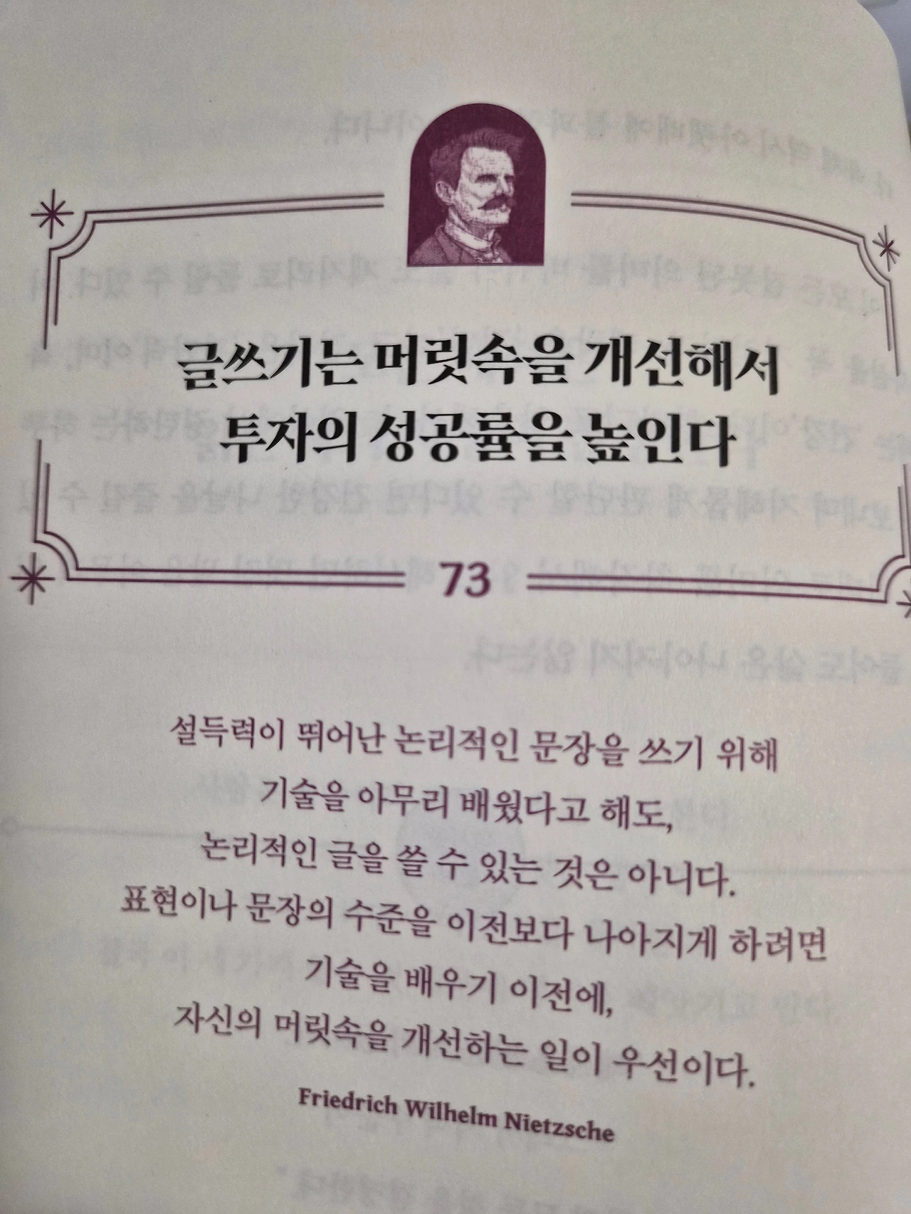 기술만으로 논리적인 글쓰기가 완성되지 않습니다. 들은 것을 선택하고 선택한 것을 사색하며, 사색한 것을 자기 것으로 만들어야 합니다. 니체는 자신의 머릿속을 개선하지 않고는 훌륭한 글을 쓸 수 없다고 합니다.