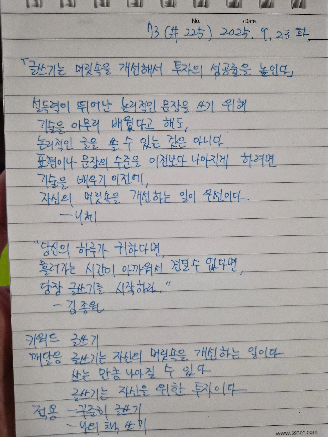 저는 매일 글을 쓰고 있습니다. 220일이 넘는 시간을 필사와 글을 쓰며 보냈습니다. 매일 밥을 먹듯 쓰다 보니 글쓰기가 일상에 자연스럽게 스며들었습니다. 글을 쓰는 순간만큼은 다른 생각이 끼어들지 않습니다. 늘 훌륭한 글을 쓰지는 못합니다. 매일 쓰는 과정에 있다는 사실이 저를 위로합니다.