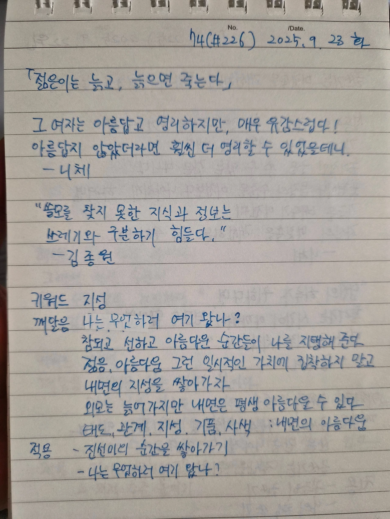 독서와 글쓰기, 사색은 우리의 영원한 자산입니다. 외모는 시간이 흐르며 쇠퇴하지만, 내면은 노력하는 만큼 빛을 더합니다. 배우고 사색하며 지성을 쌓아간다면, 세월이 쌓일수록 내면은 더욱 고귀하고 아름다워집니다. 반대로 일시적인 젊음과 아름다움에만 매달린다면, 삶은 허무로 귀결될 수밖에 없습니다.