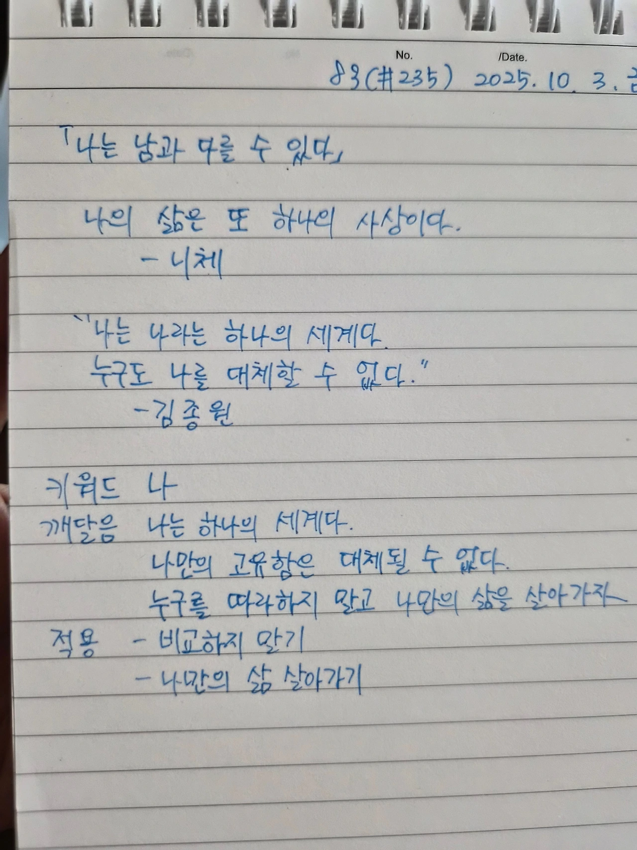 다른 사람들의 목표나 기준에 맞춰 사는 것이 아니라, 오직 유일무이한 나만의 삶을 살아갈 때 우리는 진정으로 행복하고 충만해질 수 있습니다. 나의 삶은 또 하나의 사상이며, 그 사상은 누구도 대신 써줄 수 없는 단 하나의 원본입니다.