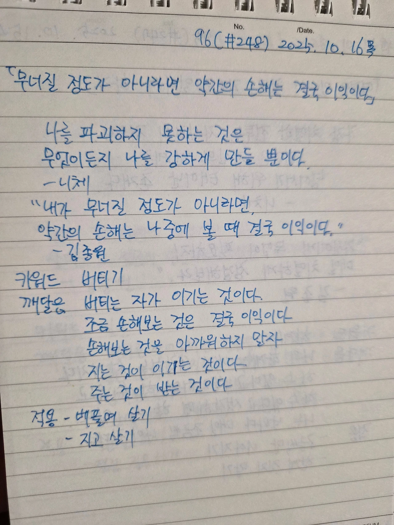 니체의 말처럼, 나를 파괴하지 못하는 모든 것은 결국 나를 단단하게 만듭니다. 시련이 찾아올 때마다 이렇게 말해봅니다.