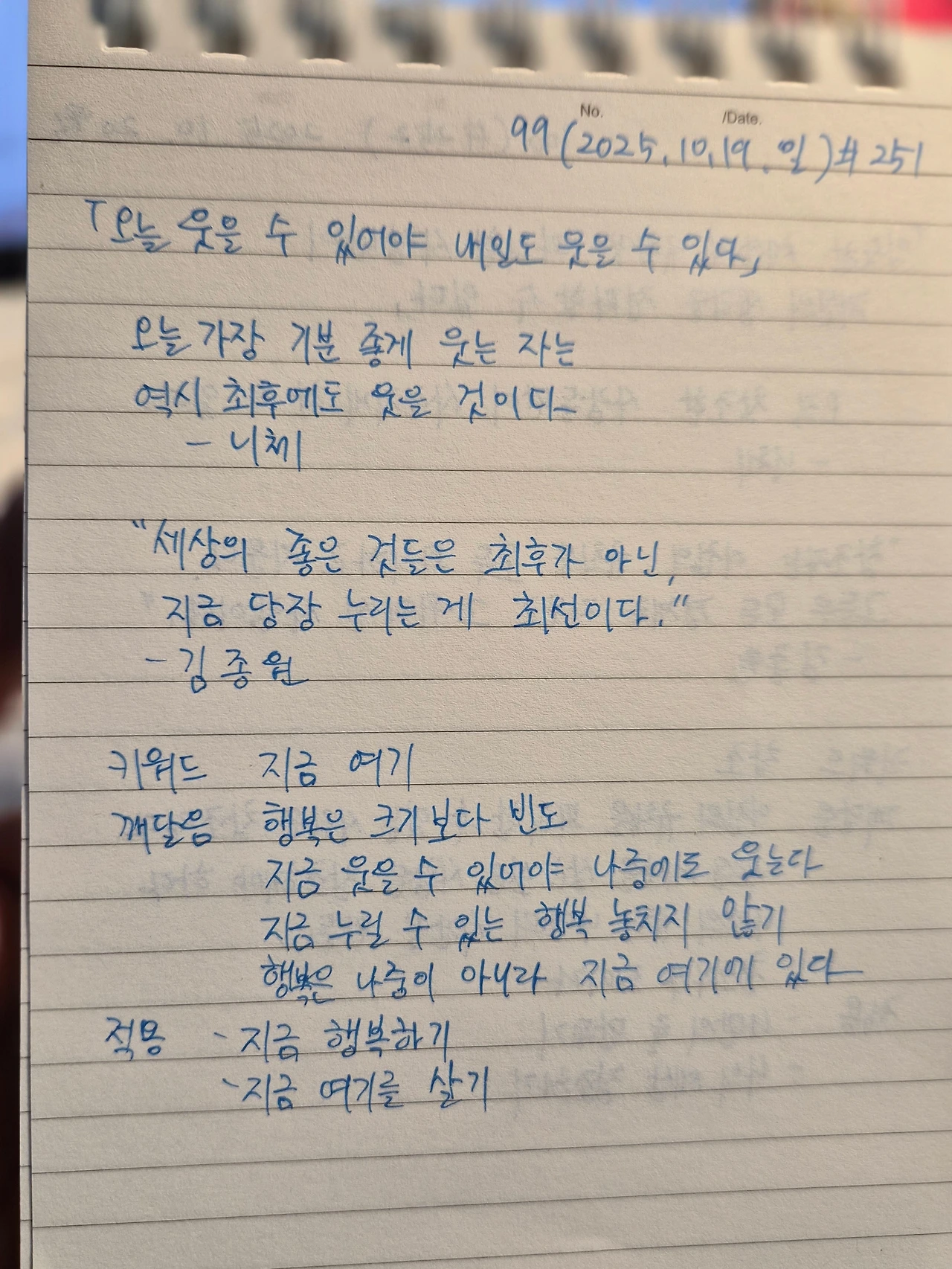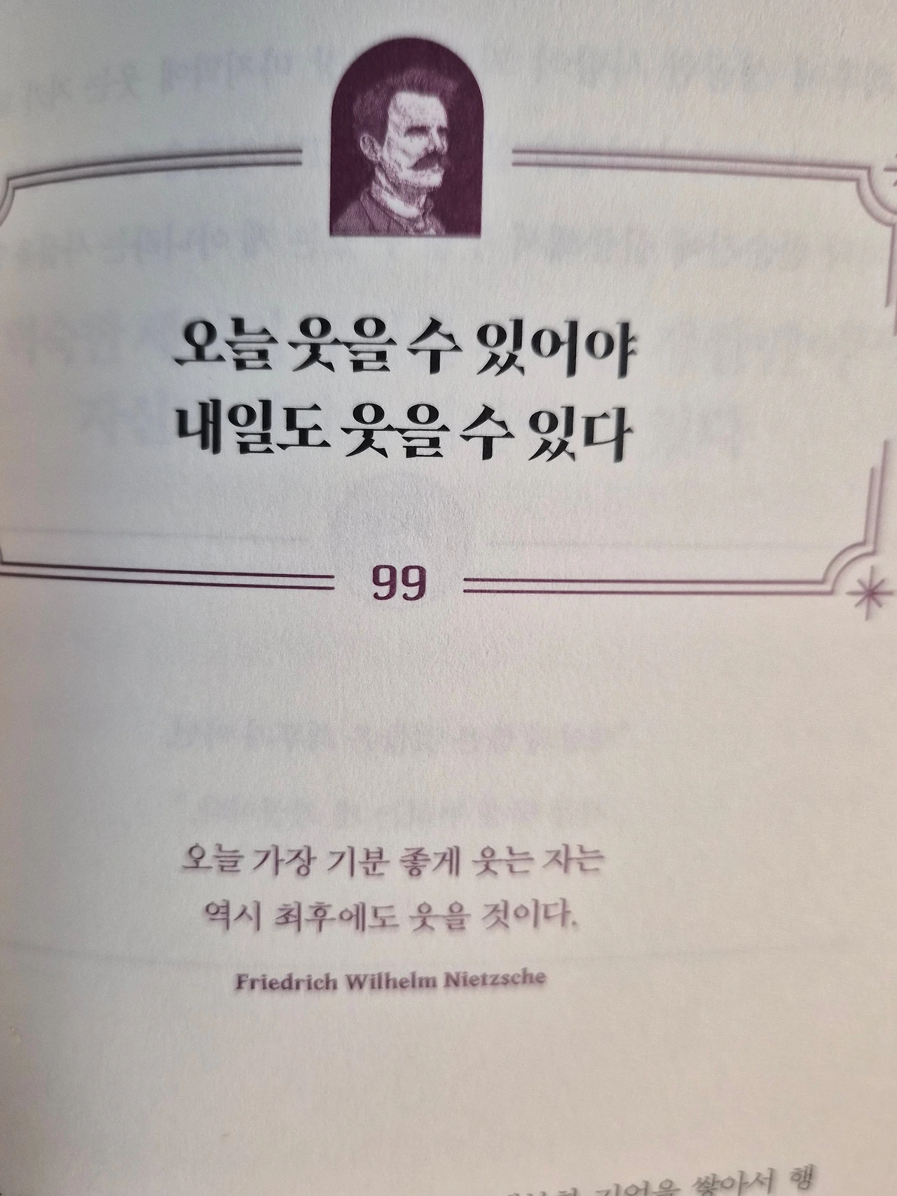 니체의 말은 인생을 살아가는 실천의 지혜입니다. 우리는 ‘나중에 웃기 위해 지금은 참아야 한다’고 생각합니다. 인생은 기다림의 연속이 아니라, 순간의 총합입니다. 오늘의 내가 쌓여 내일의 내가 되고, 매일의 내가 모여 인생이 완성됩니다.