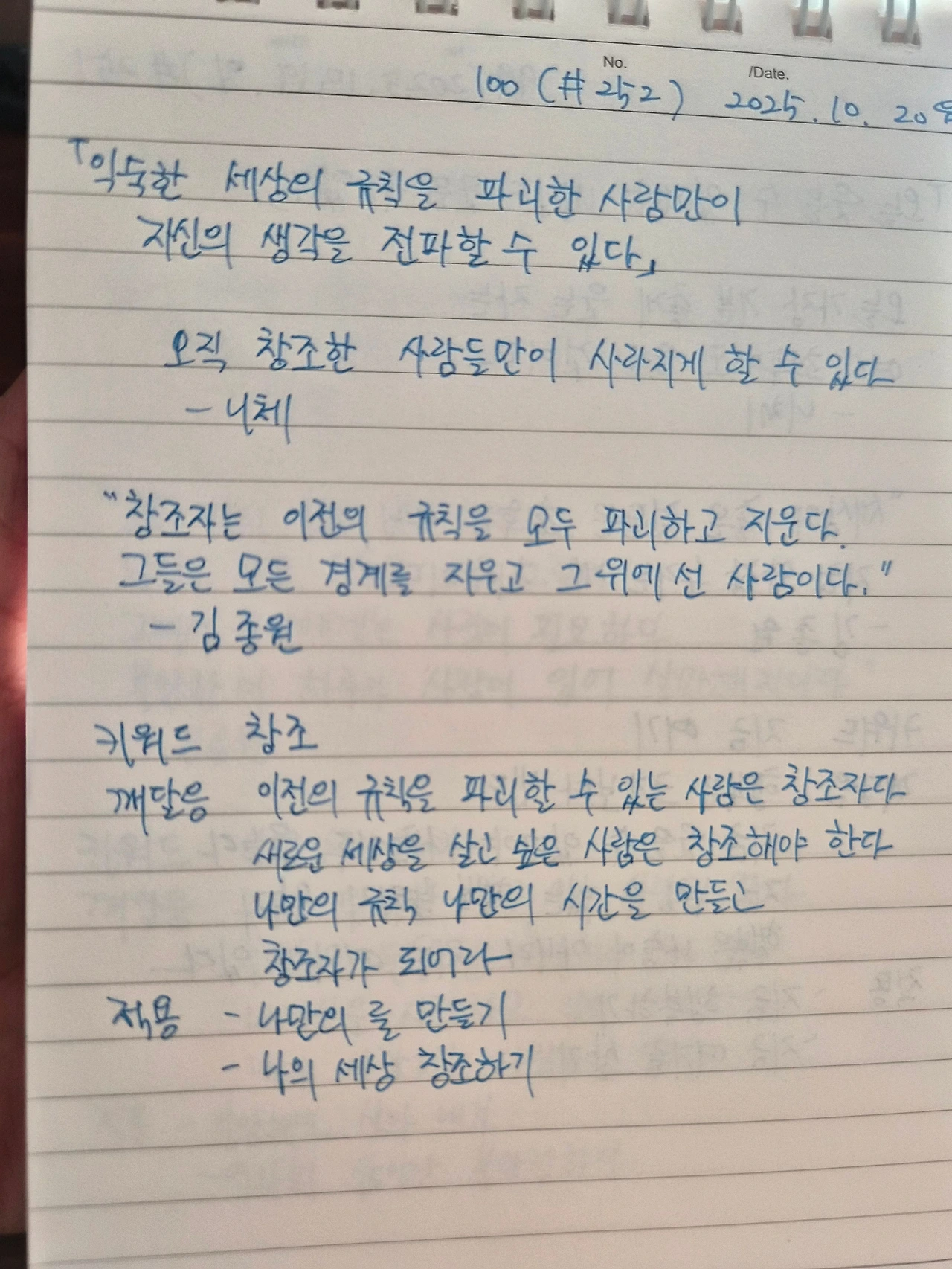창조란 단지 새로운 것을 만드는 행위가 아닙니다. 이미 존재하는 것을 ‘사라지게 할 수 있는 용기’의 다른 이름입니다. 오직 창조한 사람만이 사라지게 할 수 있다. 그것이 인생에서도, 예술에서도, 진정한 자유의 시작이다.