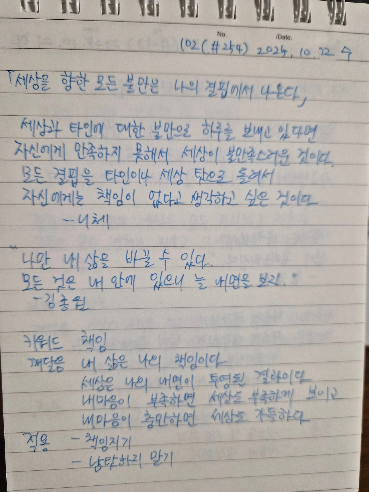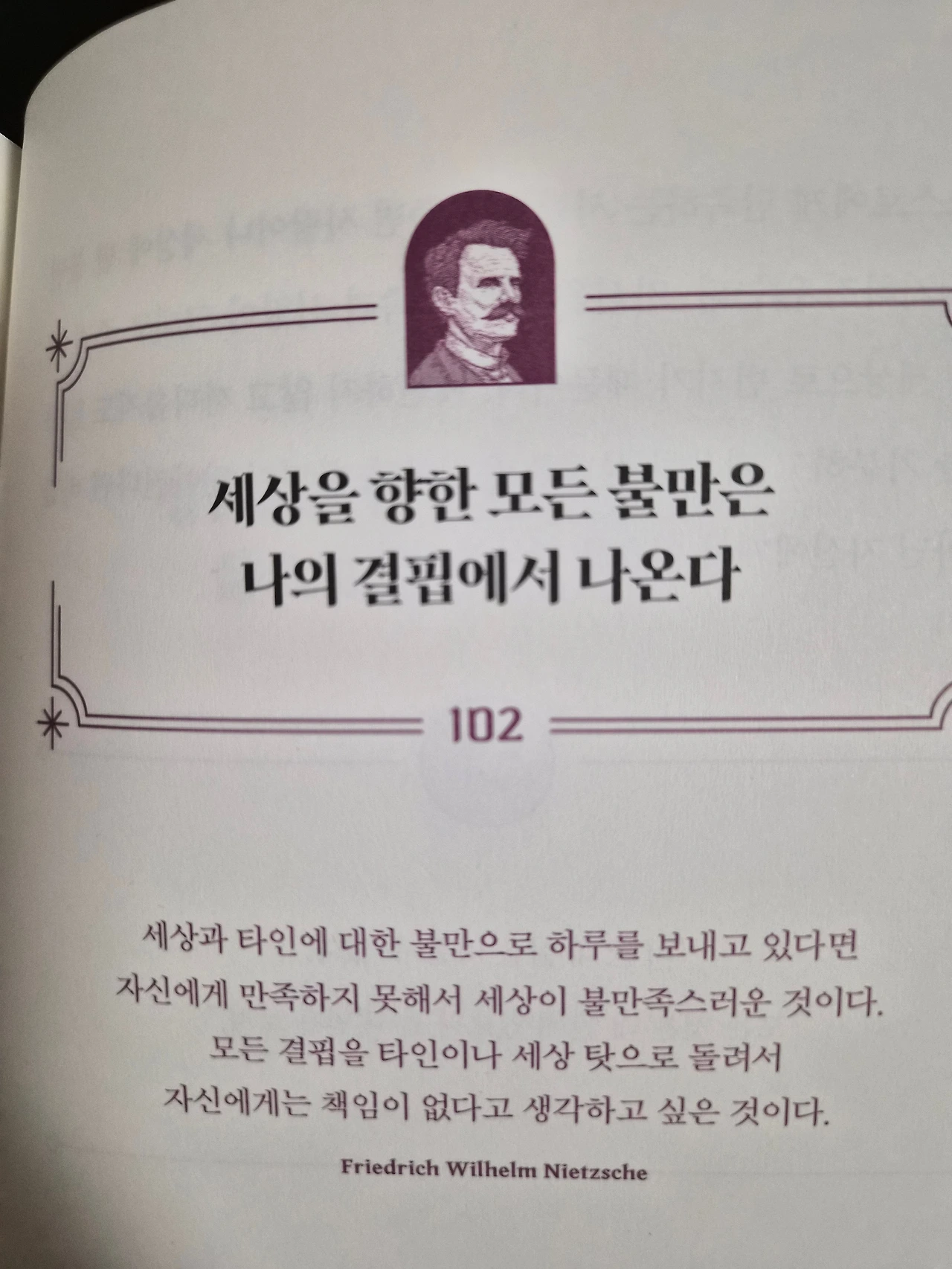 니체는 “스스로를 극복하지 못하는 자는, 세상을 탓하며 살아간다.”라고 말합니다. 오늘 하루가 유난히 불만으로 가득했다면, 세상을 고치려 하기보다 먼저 내 마음을 바라보아야 합니다.