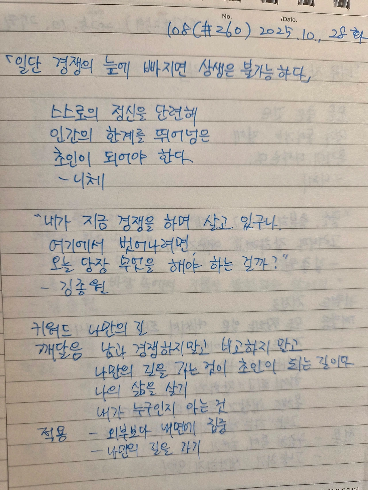 니체의 언어를 김종원 작가가 엮은 책 <한 번 사는 인생, 어떻게 살아야 하는가> 필사 108일 차입니다. 오늘이 니체 필사의 마지막 날입니다. 처음에는 그저 좋은 문장을 따라 쓰는 일이라 여겼습니다. 하루하루 글을 따라 적고 나의 생각을 정리하는 동안, 그의 언어가 내 안으로 스며들었습니다.