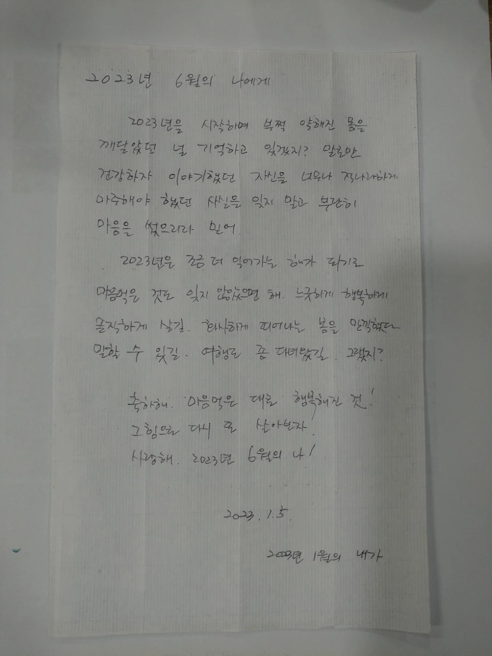 글쓰기 동아리 모임에서 지난 1월 6월의 나에게 썼던 편지다. 6개월마다 헤쳐 모여하는 모임이라 마지막 모임에서 읽었어야 하는데, 차마 읽지 못했다. 1월의 나에게 어찌나 미안한지. 올해는 정말 얼마나 일이 많았는지, 그 좋은 봄을 제대로 느끼지도 못하고 훌쩍 여름이 왔다. 당연히 여행 한 번 다녀오지 못했고 결국 지난주 MRI까지 찍어야 했던 다리 통증이 지금도 여전히 밤잠을 깨운다. 에잇.