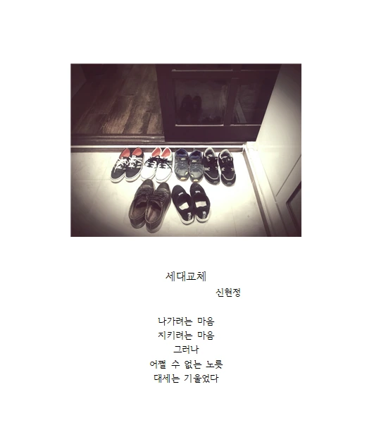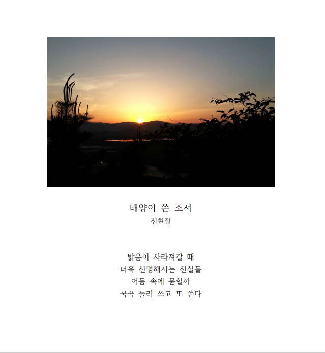 글을 쓰면서 일상을 세밀히 관찰하고 관심을 갖게 되어 삶이 더 풍성하게 가꾸어짐을 느낀다. 실은 평소 사진을 잘 찍지 않는 편이다. 이런 내가 디카시를 만나고 보니 일상을 관찰하고 의미 있게 바라보는 또 하나의 도구를 마련한 듯하여 마음이 뿌듯하다. 여전히 '사진시'와 '그림시'에 가깝지만 연습의 흔적을 기록하기로 한다.