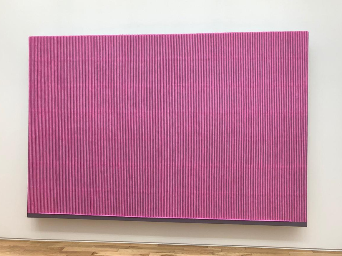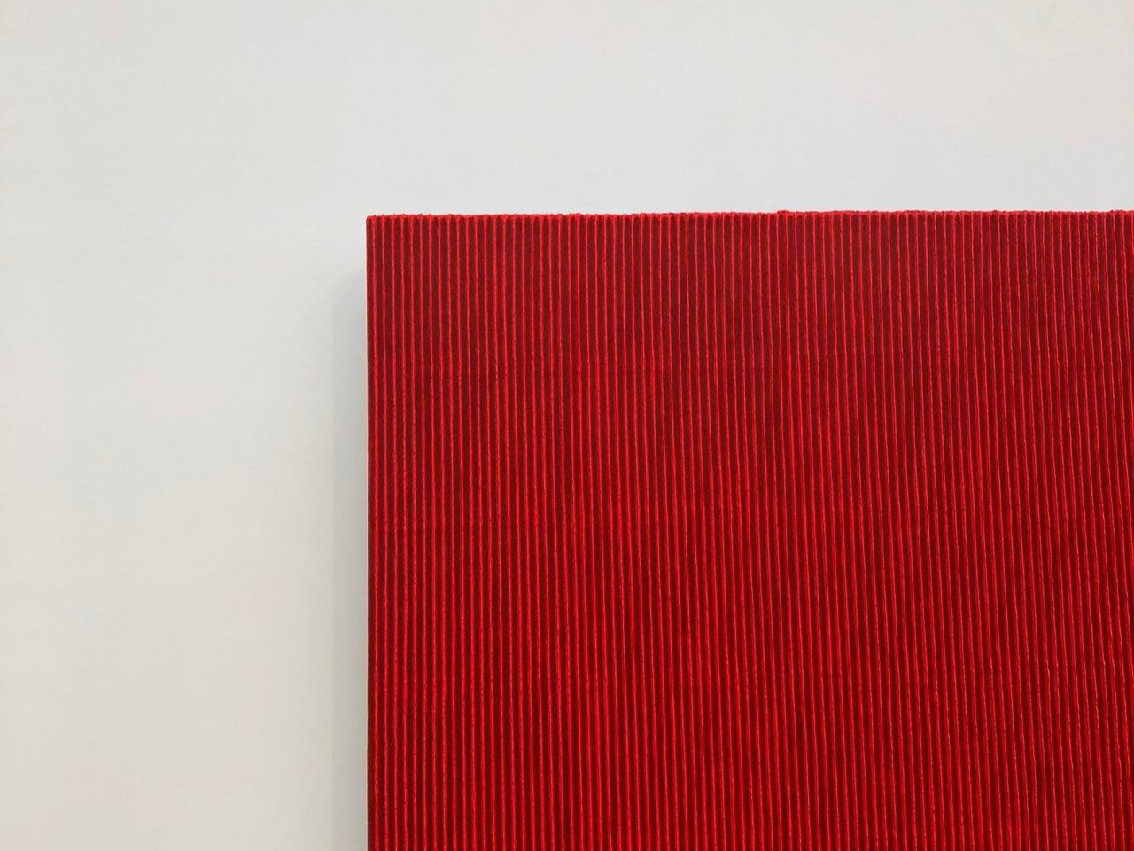 후기 묘법시기는 손을 쓰지 않았고, 화려한 색을 사용했다. 멀리서 보면 고랑과 튀어나온 선의 다른 두 가지 색이 섞인 색감이 들어오며 굉장히 촘촘한 줄무늬 옷을 보았을 때 시야가 왜곡되어 보이는 것과 같은 느낌이 들고, 가까이서 보면 줄무늬와 도드라진 원색의 색감이 조금 더 잘 드러난다.(바로 아래 사진처럼) 특히 아래 붉은색 작품은 작품 색도 강렬하지만 크기도 커서 전시장에서 관람객들의 시야를 확 사로잡고 있었는데, 나에게는 그림이 아니라 네온사인이 켜진 화면을 보는 느낌으로 다가왔다.