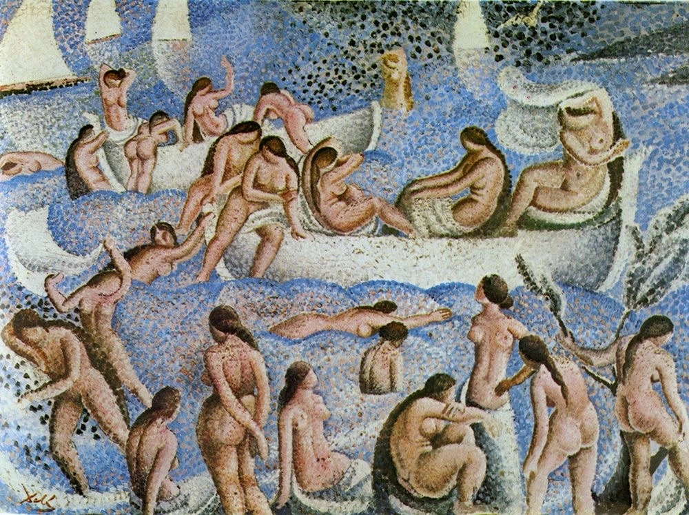 '에스 야네르의 목욕하는 사람들'은 달리가 입체파의 영향을 받은 시기에 그린 작품으로, 달리에게 이런 화풍이 있었는지 전혀 알지 못했기에 처음 그림을 마주했을 때 너무 새로웠다. 무엇보다 목욕하는 사람들의 신체를 점묘화로 마치 자연의 일부분인 것처럼 표현해 낸 접근법이 좋았고, 그림을 보고 있으니 인간의 신체를 이루는 곡선이 아름답다는 생각이 절로 들었다. 피카소에게 엄청난 존경심을 드러냈다는 달리가 어떻게 자신만의 화풍을 구축해 가는지 그 과정을 담은 작품이기에 매우 의미 있게 느껴졌던 것 같다.
