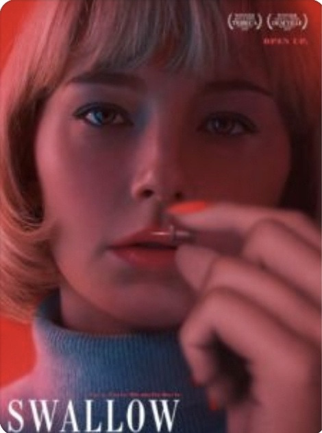 영화 <스왈로우 swallow>에서 주인공 헌터는 강간범에 의해 생긴 아기다. 친부도 친모도 아기를 기대하지 않았다. 뱃속에서부터 이미 거절된 아이였다. 환영받지 못한 존재로 태어나, 이후로도 그녀는 의붓아버지와 씨다른 형제들 사이에서 소외감을 느끼며 살아간다. 그런 그녀에게 행운이 찾아온 것일까...재벌가의 상속자와 결혼을 하게 되어 그의 아기를 갖게 된다. 엄마의 뱃속에서 '이물질'로 살았던 그때에 느꼈던 거절감이 자극된다. 임신 소식 이후 그녀는 먹어서는 안될 이물질들을 삼키기 시작한다.
