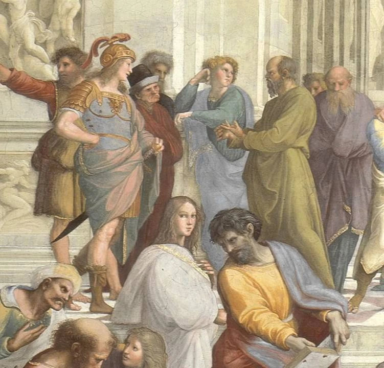 피타고라스와 헤라클레이토스 사이에, 이 그림의 유일한 여성이 비스듬히 서서 관람자를 바라보고 있다. 세계 최고의 고대 지성들 가운데 한자리를 차지하고 있는 여성은 히파티아(Hypatia)이다. 그녀는 인류 역사상 가장 걸출한 여성 중 한 명이다. 수학자이자 천문학자, 뮤즈의 여신, 철학자였고, 외모 또한 매우 아름다워 대중의 열광을 받았으나, 안타깝게도 여성이 수학을 잘하는 것을 마녀라고 간주한 기독교 일파에 의해 피부가 벗기어진 채 고통스럽고 잔인한 죽임을 당했다. 만약, 이 54명의 쟁쟁한 인물들 가운데 한 사람과 이야기를 나눌 수 있는 기회를 얻는다면 누구를 선택하겠는가?