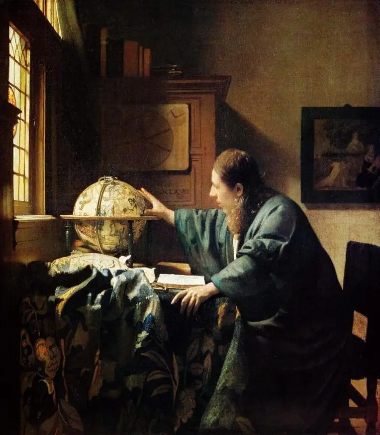 천구의 왼쪽 상반부에 큰곰자리가 그려져 있고, 책상에는 천문 관측기가 비스듬히 놓여 있다. 펼쳐 놓은 책은 천문학과 지리학 지침서이다. 이 천문학자는 페르메이르의 이웃이었던 과학자 반 레이우엔훅일 가능성이 높다. 처음으로 광학렌즈를 발명한 그는 페르메이르가 카메라 옵스큐라 기법으로 그림을 그릴 수 있도록 도움을 주었을 것이다. 당시 네덜란드는 현미경, 망원경을 발명했을 정도로 광학 강국이었다. 그 또한 카메라 옵스큐라(바늘구멍 사진기)를 사용해 그림을 그리는 등 광학 현상에 관심을 두었다. 그가 카메라 옵스큐라를 통해 보이는 물리적 공간 속에서 일어나는 빛의 현상을 세밀하게 묘사하려고 했기 때문에, 그의 그림은 사진과 같은 느낌을 준다. 이와 함께 페르메이르는 그만의 독자적인 색감, 빛의 대조, 고요한 분위기 속에서 일상생활의 모습을 담았다. 17세기 네덜란드는 당시 유럽의 과학 발전에 고무되었고, 특히 천문학, 망원경의 발전으로 결과된 항해술에 힘입어 해외 상업과 무역 활동이 왕성한, 번영하는 나라였다. 자연스럽게 천문학에 대한 일반의 관심도 높았고, 이러한 역사적, 사회적 분위기는 한 화가의 그림에서 천문학자가 모델로 나타나도록 했으니, 미술은 단지 심미적 만족을 충족시키는 수단을 넘어서서 인간 사회와 문화를 이해하는 중요한 매개체가 될 수 있다는 것을 보여 준다.
