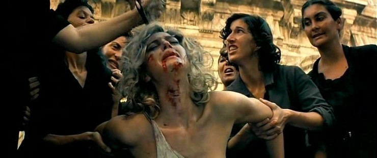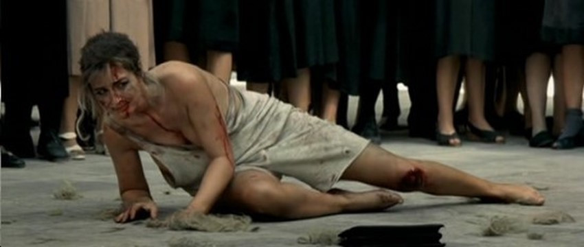 마침내 전쟁이 끝나고, 독일군이 물러가자, 마을 여자들은 그녀를 거리로 끌어내 독일군에게 몸을 판 매춘부라고 욕설을 하며 집단 구타를 한다. 고래고래 소리를 지르며 머리칼을 자르고, 때리고, 옷을 찢는 광포한 여인들의 히스테리칼한 폭력.