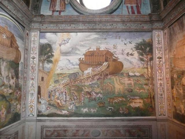 16세기 베네딕토회 수녀원 '산 마우리치오 알 모나스테로 마조레'(San Maurizio al Monastero Maggiore)는 아름답고 화려한 벽과 천장 프레스코화로 인해 '밀라노의 시스티나 예배당'으로 불린다. 수도원에는 창세기 홍수 설화 '노아의 방주'를 세 가지의 다채로운 이미지로 묘사한 벽화가 있는데, 위 작품은 그중 맨 오른쪽에 위치한다. 당대 밀라노의 유명한 화가 아우렐리오 루이니(Aurelio Luini)가 그린, 이 수도원의 보물 같은 예술품들 중 하나다.