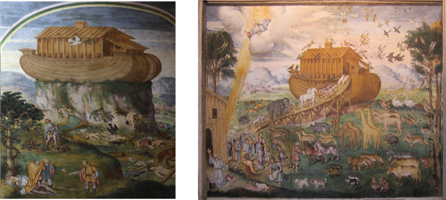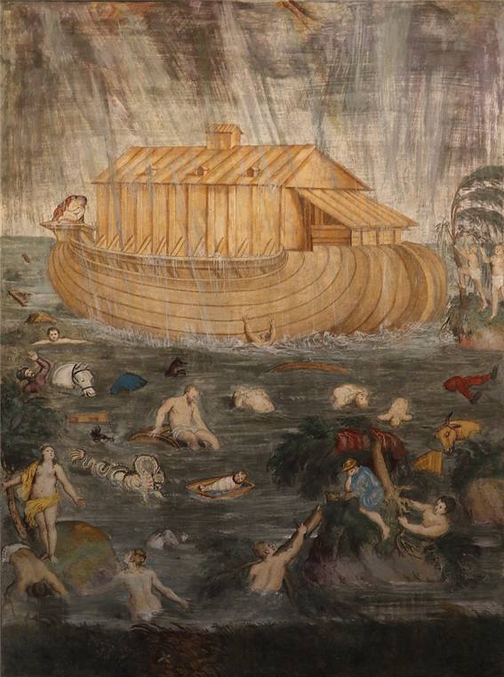중앙의 벽화는 노아 가족과 유니콘, 원숭이, 기린 등 지상의 모든 짐승이 한 쌍씩 짝을 지어 거대한 방주에 들어가는 장면이다. 화가는 동물 중에 자신이 기르는 개도 그려 넣었다. 왼쪽 그림은 대홍수가 끝난 후의 세상을 묘사한다. 하늘엔 무지개가 뜨고 방주는 땅 위에 정박해 있다. 배 밖으로 나와 육지에 발을 디딘 노아와 그의 세 아들이 보인다. 곳곳에 물난리로 죽은 사람들과 동물들이 참혹하게 쓰러져 있고, 까마귀는 한쪽 구석에서 시체를 쪼아 먹는다. 나무는 뿌리째 뽑히고 가재도구가 어지럽게 널려 있는 세상의 종말 모습이다.