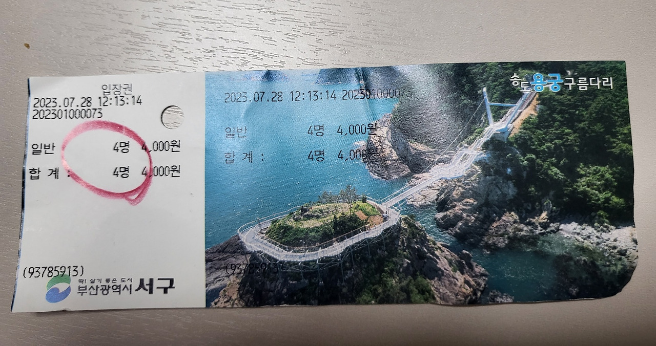 입장권 속 용궁구름다리 전경. 겨우 점심 전 일정까지만 썼는데도 숨이 차네요. 가는 곳마다 덥고 숨찼던 그날의 열기가 느껴집니다. 너무 더웠으니 당연히 투덜거리고 짜증도 냈지만, 괜히 왔어라는 말은 하지 않는 아들이었습니다. 예전엔 괜히 왔다는 말을 참 많이도 했거든요. 그러면 엄마라서 또 속상하고 혼내고 했지요. 이젠 어느 정도 자기 선택에 책임을 지려 하는 모습을 보면서 다른 집 아이들보단 늦지만 아들은 자신만의 속도대로 성장하고 있음을 인정하는 하루였습니다. 너무 더웠습니다. 부산은 바닷가에서 놀 게 아니면 여름에 가지 않기를 추천하지만 생각보다 가는 곳마다 사람들도 많고 외국인도 많았답니다. 더위에도 사람들은 밖으로 밖으로 나왔네요. 아무리 더워도 역시 여행의 계절은 여름입니다.