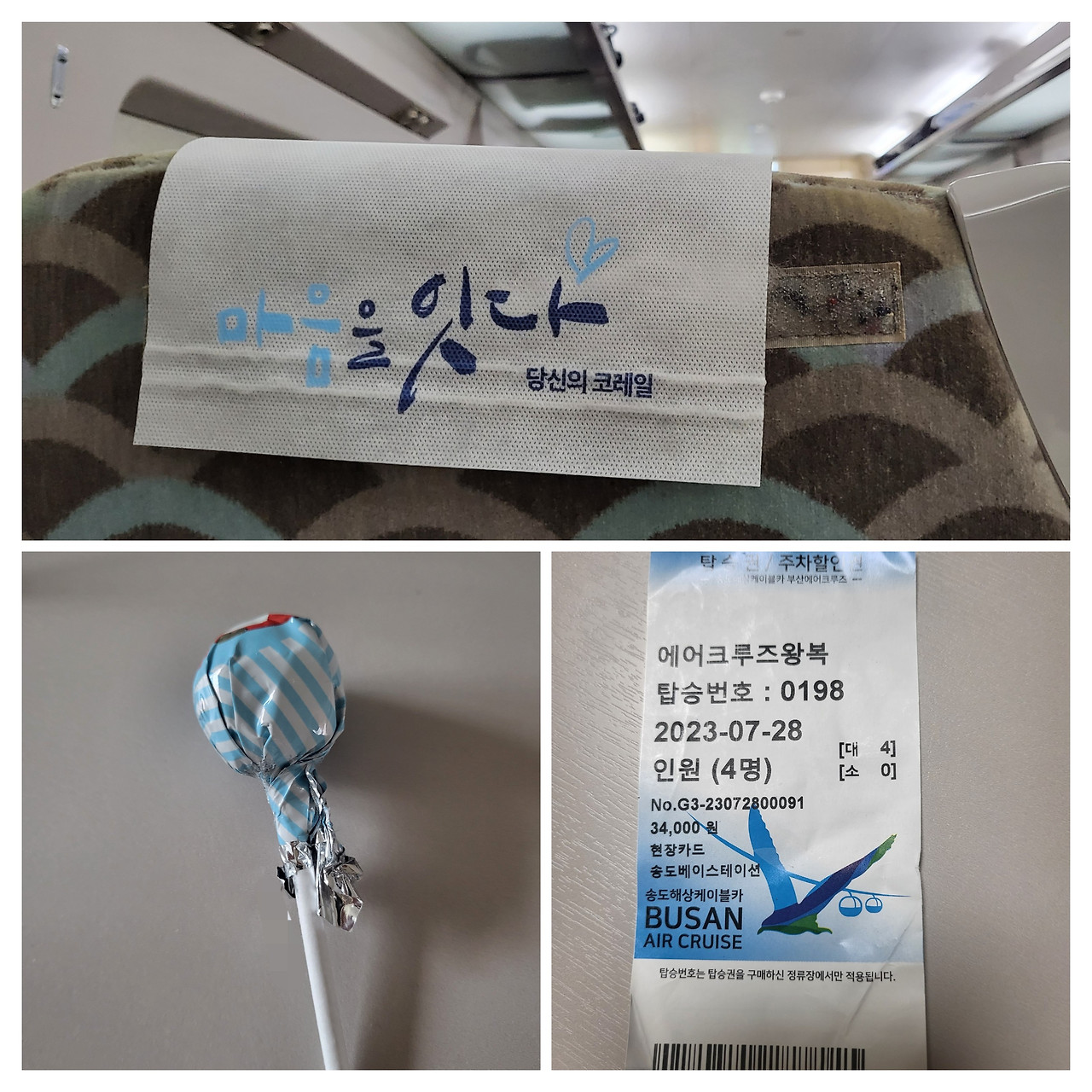 케이블카 탑승 전 인원수만큼 주는 막대 사탕. 2인용을 지불한 탑승권. 1인당 17000원. 케이블카를 타기 전 사탕을 인원만큼 준다. 막대사탕을 물고 가는 동안 아이가 된 것 같아 조금은 마음이 들뜨는 걸 보면 막대 사탕을 주는 건 괜찮은 선택이다. 탁 트인 바닷가를 바라보며 숨 돌릴 틈이 있어서 좋았고 케이블카에 냉방기가 없으니 더울까 걱정했는데 높은 고도라서 바닷바람이 시원하게 들어와서 괜찮았다. 아들은 케이블카 안에서도 계속 투덜거렸다. 마음을 진정시키려고 막대사탕을 물었다. 마음이 답답할 땐 단 것을 먹든 장소를 바꾸든 탈출구를 찾아야 된다.