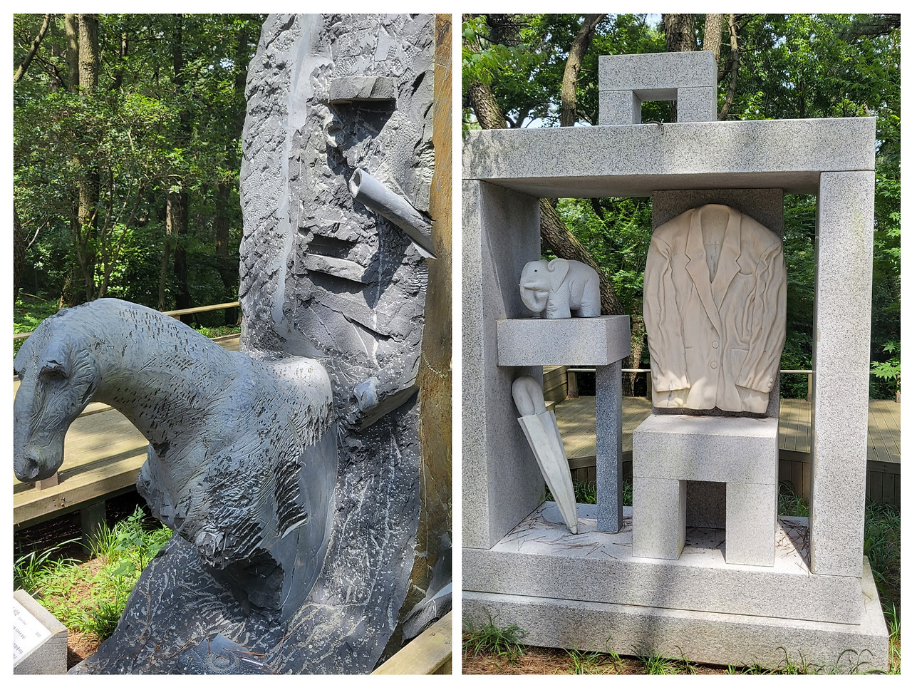 공원 산책 중 찍은 작품들. 왼쪽은 잃어버린 시간(김근배). 작가의 문명관을 표현한 작품이며 말은 작가 자신, 하반부는 문화, 상반부는 문명, 배면은 시간을 상징한다고 한다. 오른쪽은 여정(이영춘). 거대한 가방 속 여행자의 파생물인 재킷, 우산, 안식처인 의자, 자연을 상징하는 코끼리를 표현하여 여정을 상징화하였다고 한다.