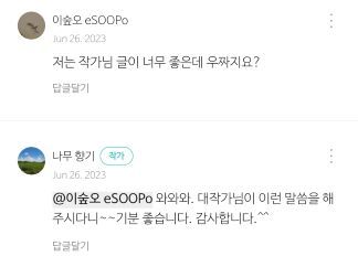 글을 써야 되나 말아야 되나 고민할 때 작가님들은 힘이 되어 주었다. 첫 번째는 이숲오 작가님. 독자가 몇 명 되지도 않고 댓글도 전무하던 시절 다작에 대한 부끄러움을 털어놓는 글에서 힘을 주셨다. 사실 그 글을 쓰면서 글을 그만 써야 될까 고민을 엄청 했었는데 작가님의 1호 댓글은 큰 힘이 될 수밖에 없었다.