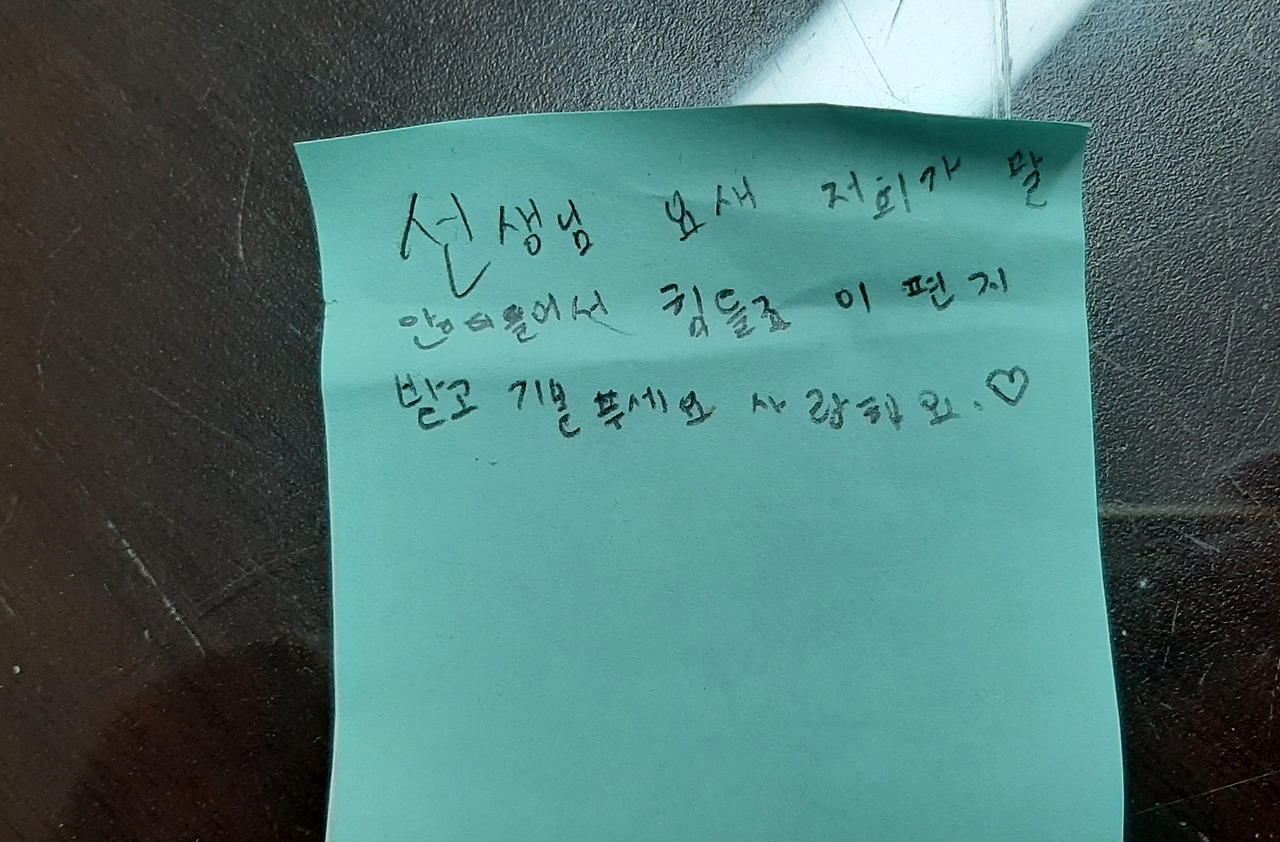 오늘 제가 힘들어 보였는지 익명으로 쪽지를 써 놓고 갔네요. 글씨를 보면 누군지 알지요. 아이들의 이쁜 마음 때문에 또 하루를 견뎌나갑니다.