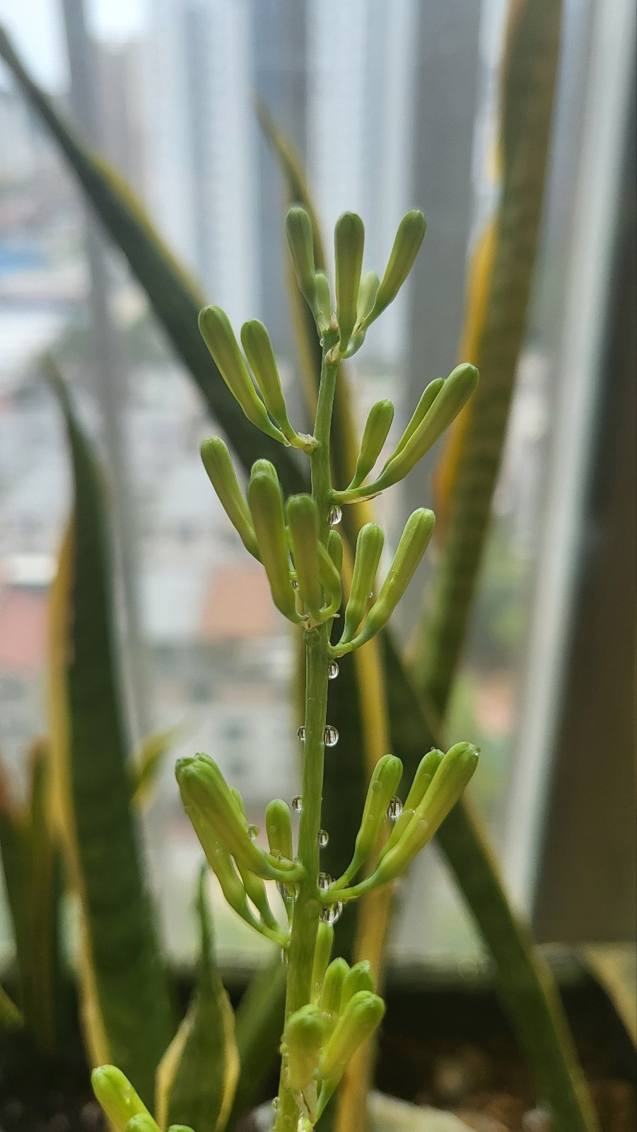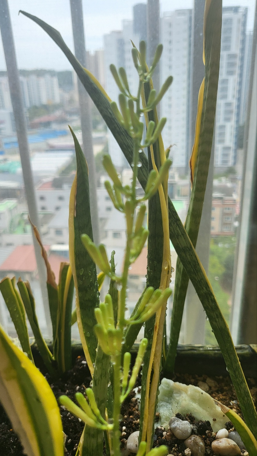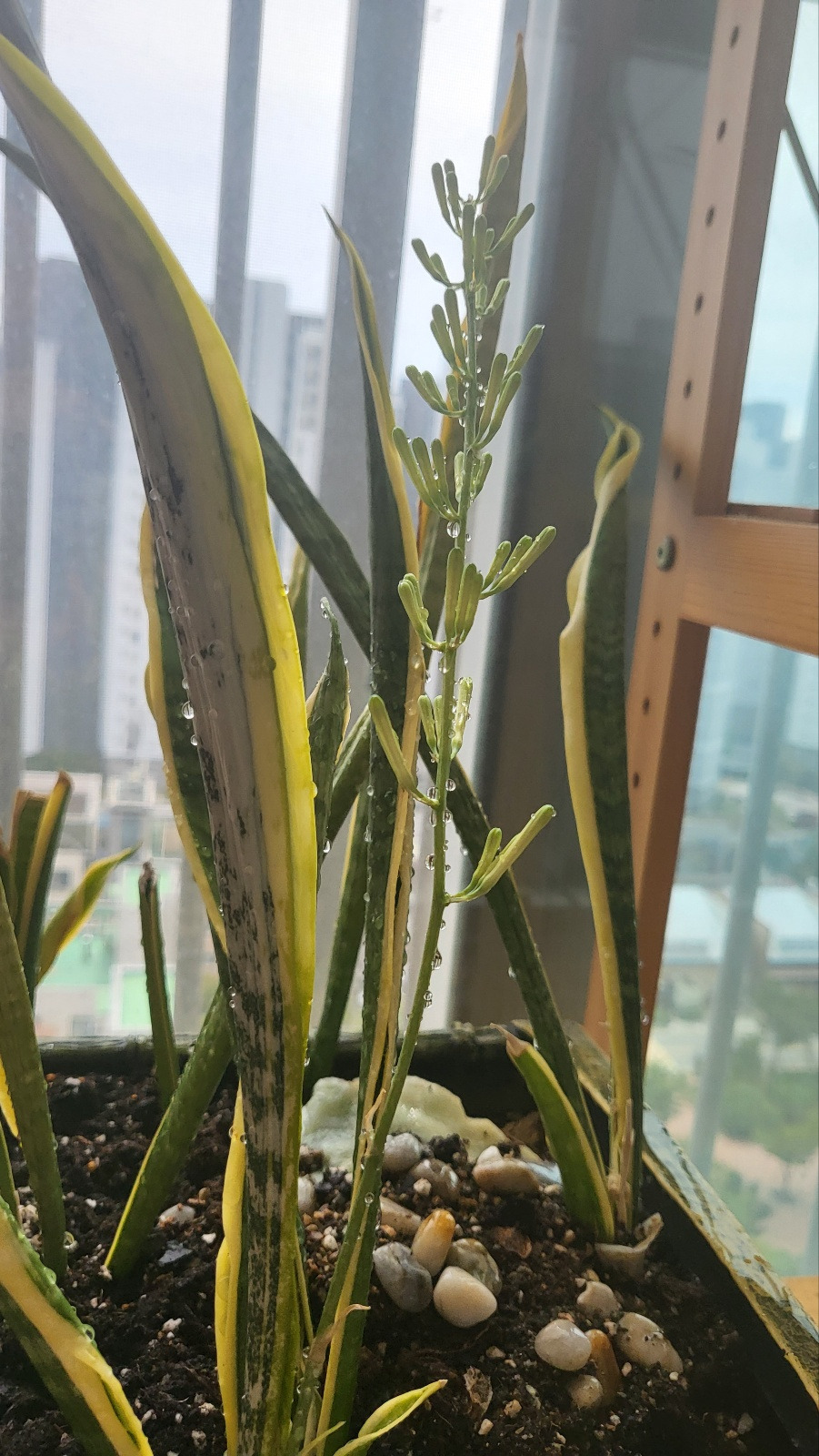 하지만 한편으로 이렇게 돌보지 않았더니 스스로 살고자 꽃을 피운 산세베리아가 측은하면서 대견하기까지 하다. 꽃대는 아직 꽃을 피우지 않고 맺힌 상태이다. 내일 흰꽃을 피울까? 모레 피울까?