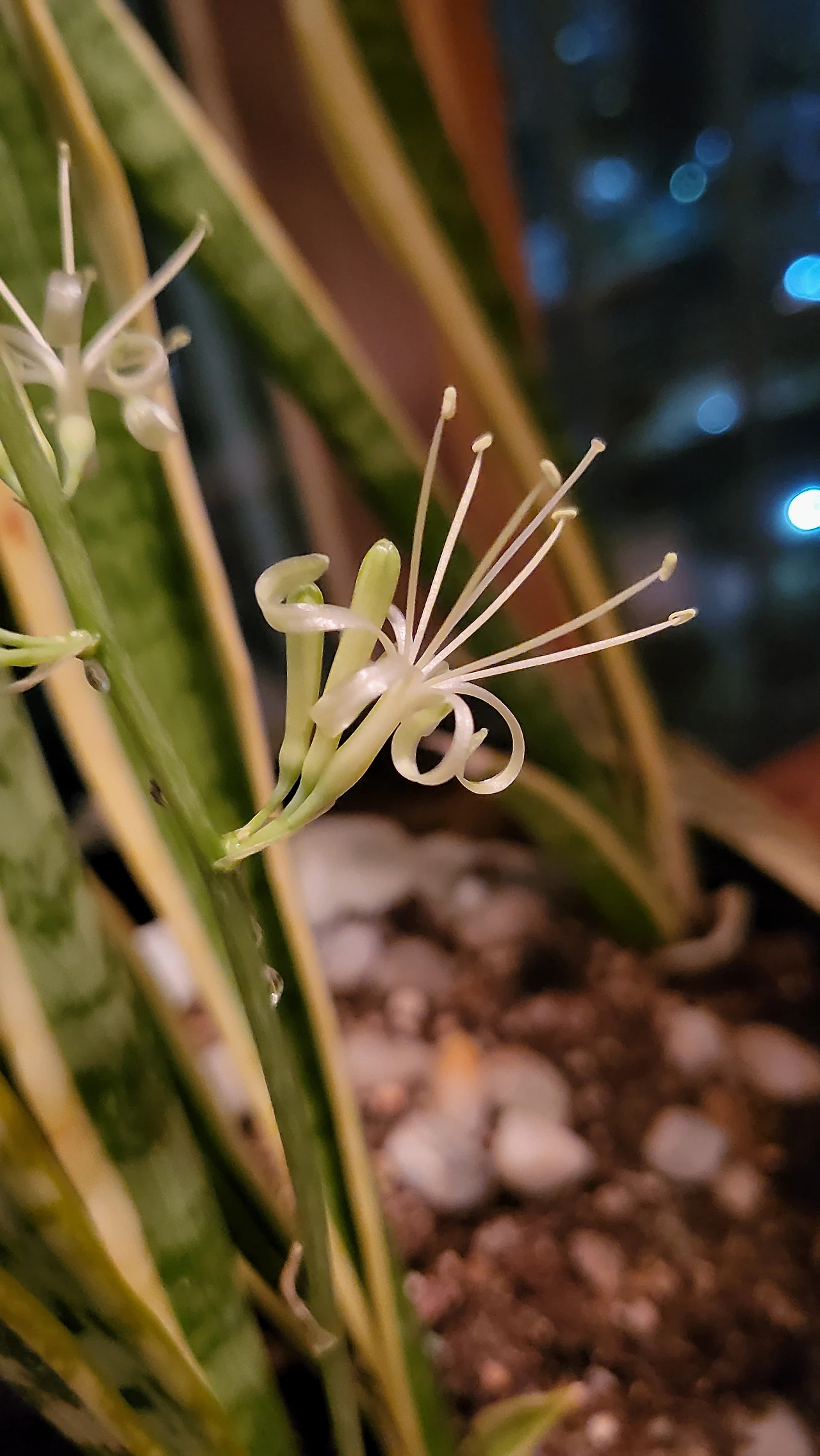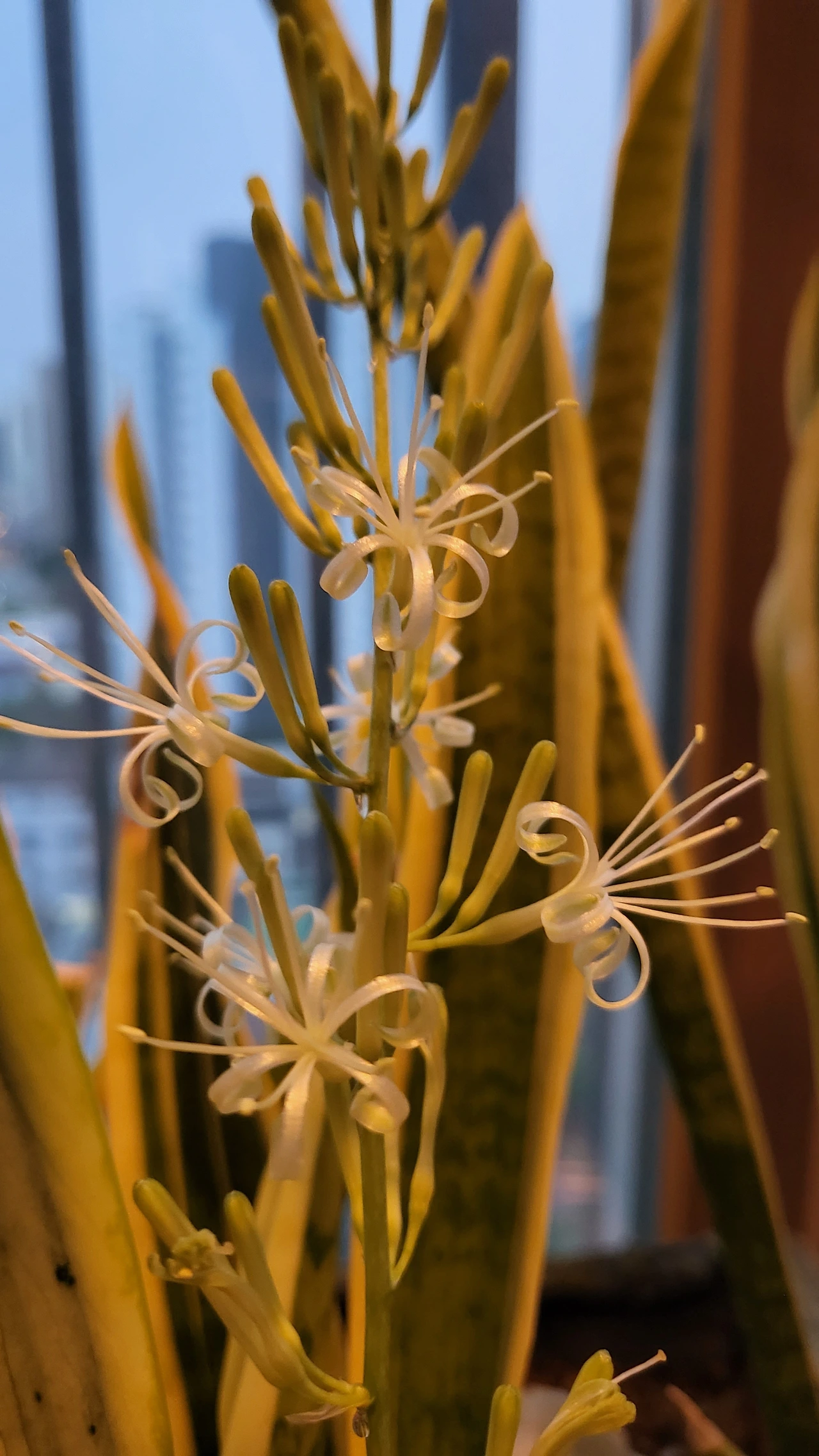 그런데 산세베리아 한쪽에 몇 년에 한 번씩 피는 꽃이 피어 있다. 꽃대를 보는 순간 미안함이 더 몰려온다.
