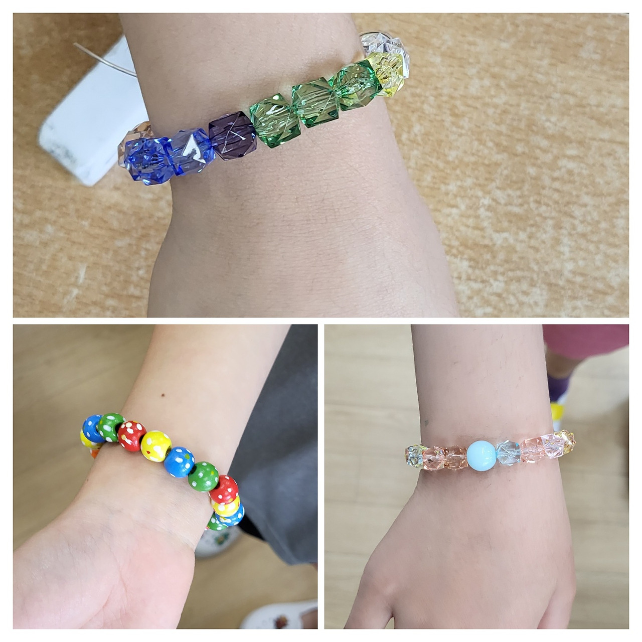 오늘 수학 분류하기를 다 배우고 구슬을 기준을 세워 분류한 후 팔찌 만들기를 했습니다. 아이들 가는 손목에 블링 블링 빛나는 팔찌가 너무 예쁩니다.