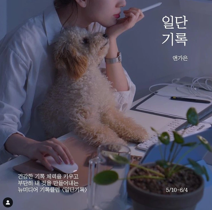 집에 와서 어떤 날은 브런치 글을 쓰고, 어떤 날은 블로그를 쓰고, 어떤 날은 인스타그램을 눈팅하고, 어떤 날은 영상을 찍고 이것저것 해보는 것이 좋았다. 여러 플랫폼을 기웃기웃 거린 나의 행동들이 금전적인 수익은 가져다주지 못했지만, 그 대신 마음의 안정을 얻었다. 특히 여러 플랫폼보다 글 쓰는 플랫폼이 나에게 좀 더 맞는다는 것도 알게 되었다. 글 쓰는 것이 좋았지만, 몸이 힘들거나 지치는 날에는 키보드에 손을 올리기가 힘들었다. 슬슬 혼자 글 쓰는 것에 지쳐가고 있을 때, 문득 인스타그램 스토리에 올라오는 #일단기록 을 만났다. 사실 #일단기록이라는 플랫폼보다 그 안에 강아지가 너무 귀여웠다.