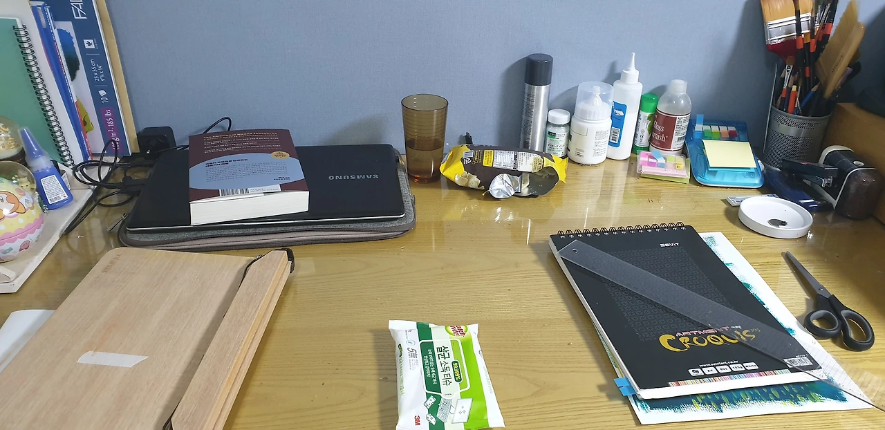 음, 무슨 작업을 하려고 책상을 정리하는데, 뭔가... 굉장히 어수선한 게 지금 내 마음 상태 같아서 찍었다.
