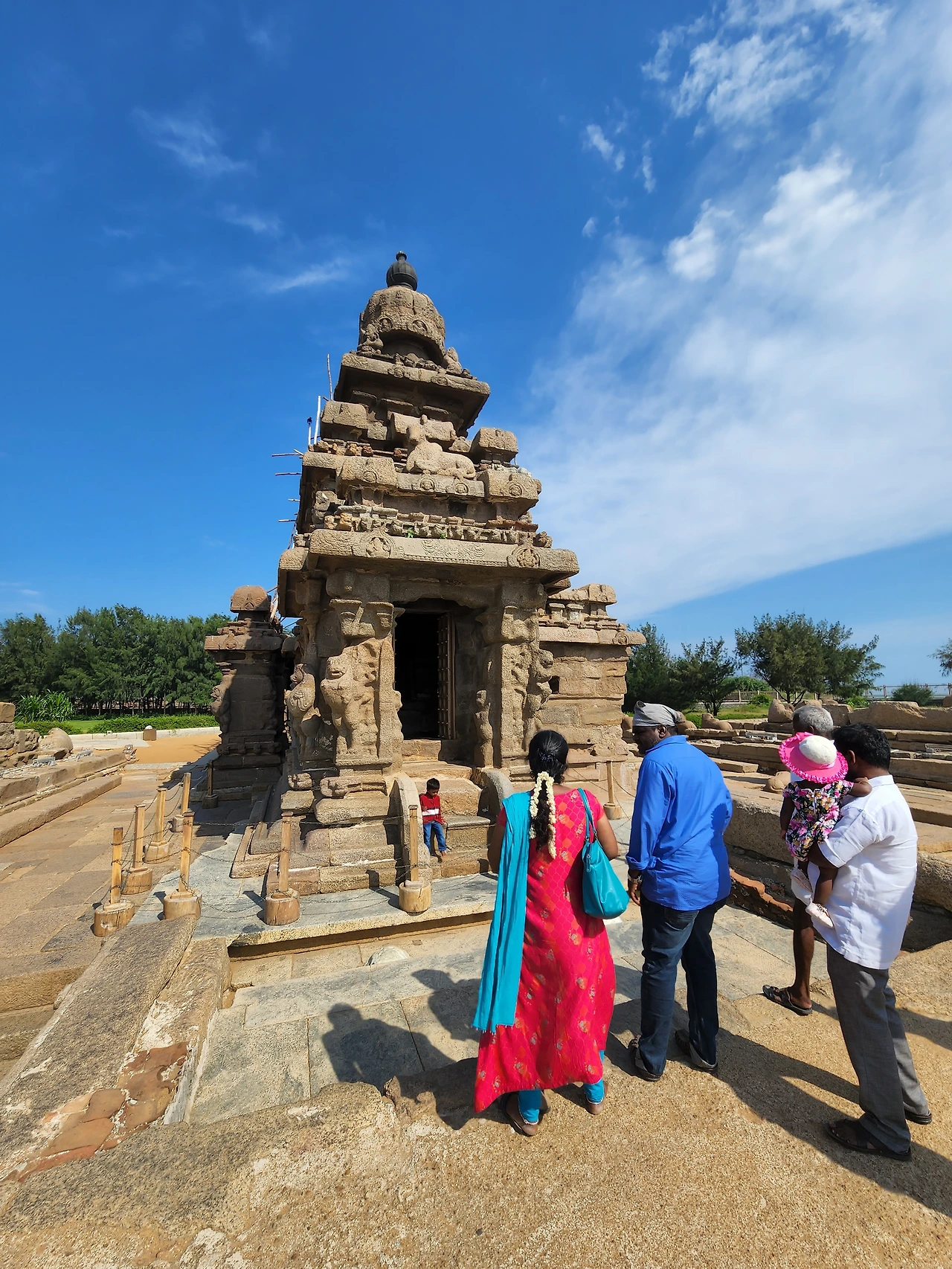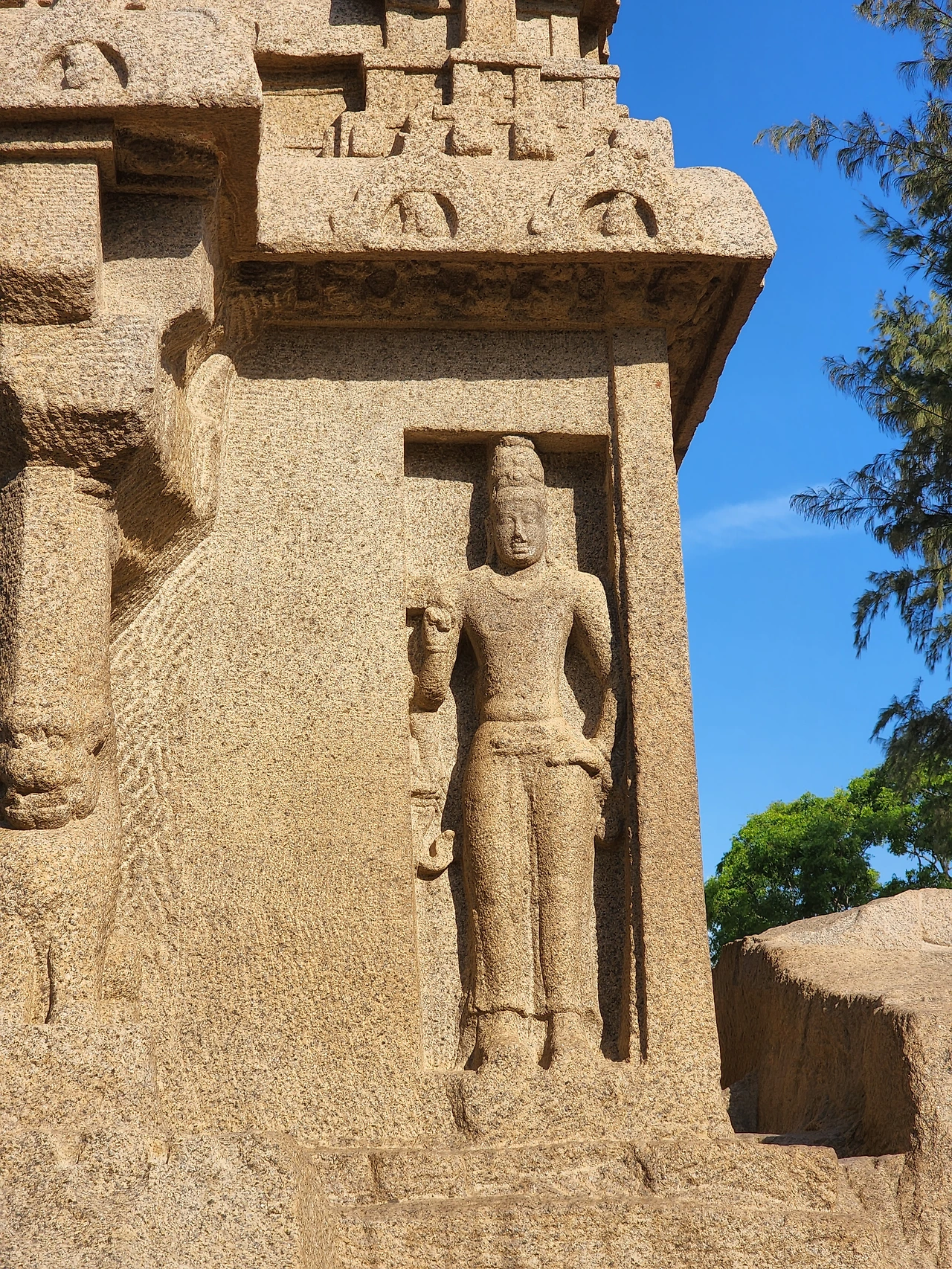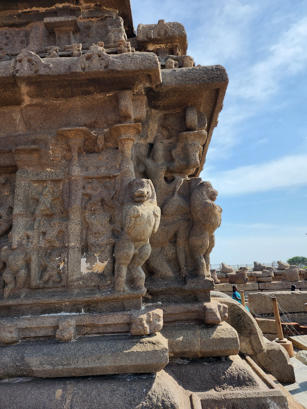시바(Shiva)의 영광을 묘사한 수천 개의 조각상이 있는데, 이 사원 외벽에 새겨진 야외 부조들로 유명하다. 높은 계단으로 이루어진 피라미드 형식의 탑 형 사원과 시바의 영광에 헌정된 수천 개의 조각품으로 이루어져 있다. 이 해안 사원의 조각 작품들은 바닷물과 대기의 작용으로 많이 훼손되었기 때문에, 특히 부조들은 희미한 형태로 남아 있다.