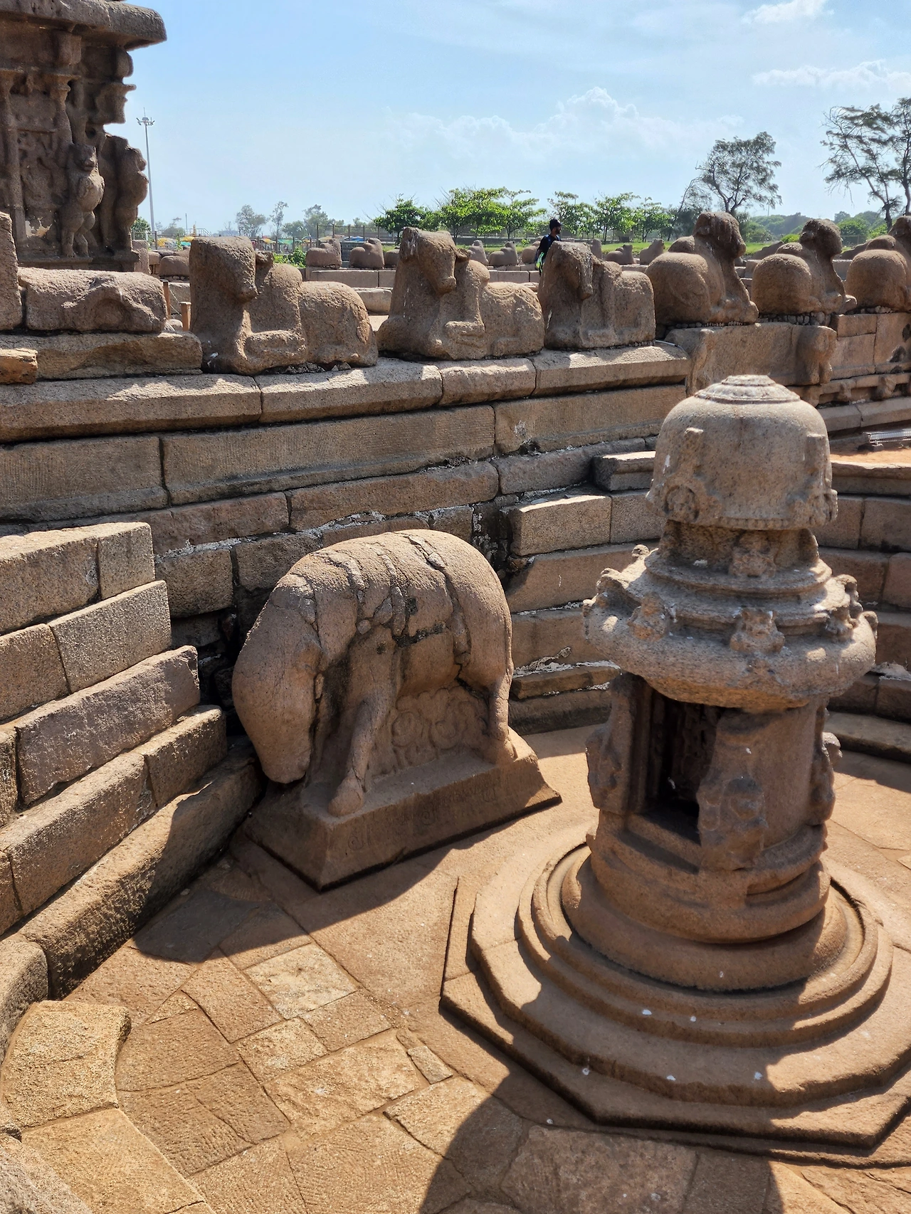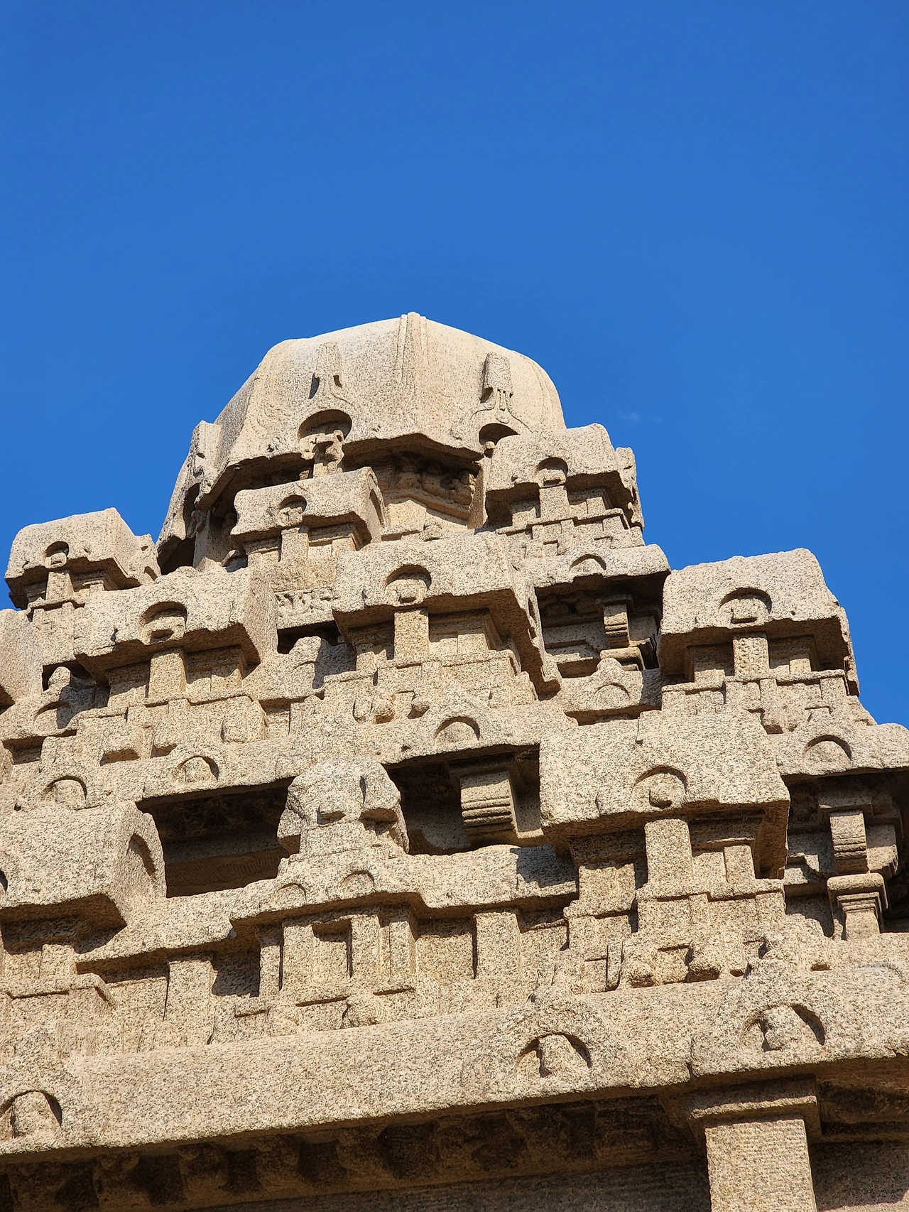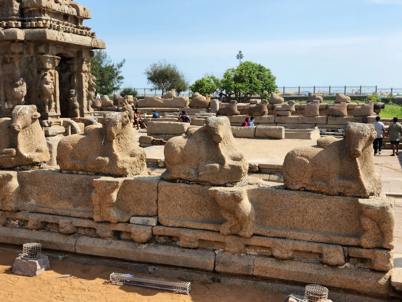 시바(Shiva)의 영광을 묘사한 수천 개의 조각상이 있는데, 이 사원 외벽에 새겨진 야외 부조들로 유명하다. 높은 계단으로 이루어진 피라미드 형식의 탑 형 사원과 시바의 영광에 헌정된 수천 개의 조각품으로 이루어져 있다. 이 해안 사원의 조각 작품들은 바닷물과 대기의 작용으로 많이 훼손되었기 때문에, 특히 부조들은 희미한 형태로 남아 있다.