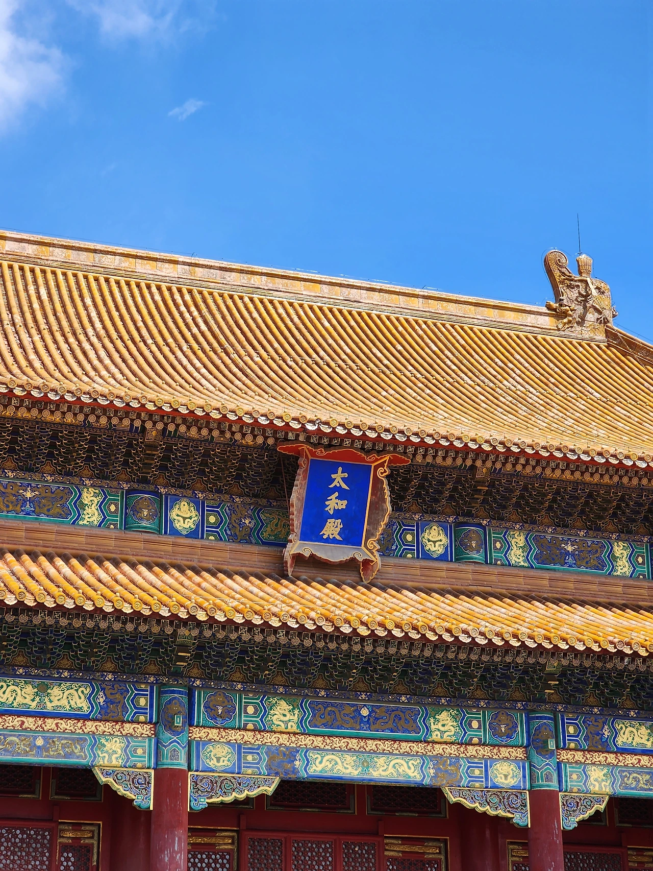 태화전은 자금성의 정전으로, 높이 8.13m의 백색 대리석 기단 위에 세웠고, 높이는 35m, 폭 66m의 건물로 자금성내에서 가장 큰 건물이며, 중국 내 현존하는 가장 큰 목조 건축물이다. 명나라 시대에 봉천전이라 칭하다가, 가정제 때 황극전으로 개칭되었고, 청나라 순치제가 '태화전'으로 이름을 바뀌었다. 태화전의 천장에는 거대한 황금색 용이 조각되어 있으며, 거대한 여의주를 물고 있다.