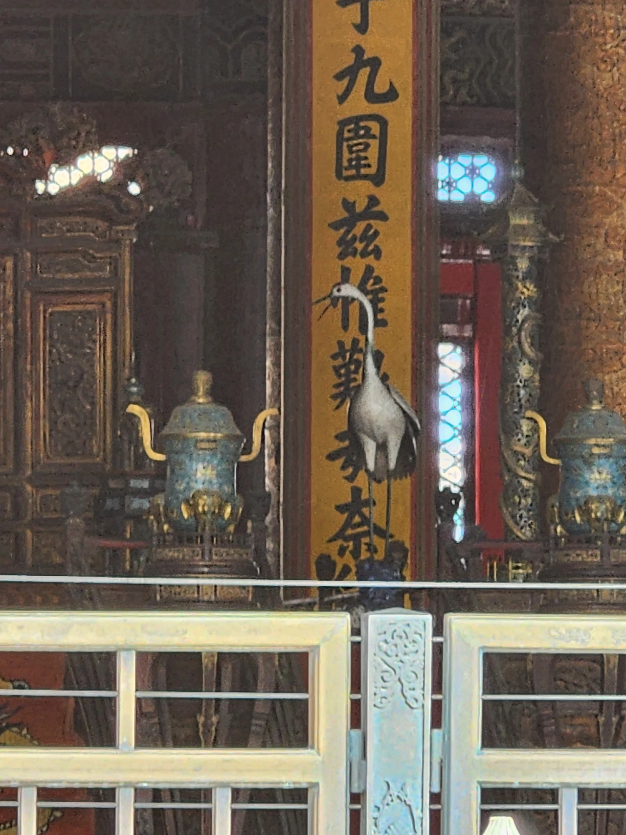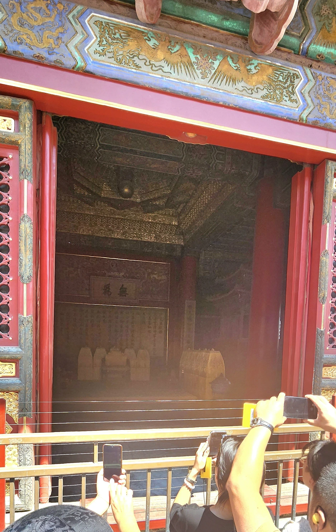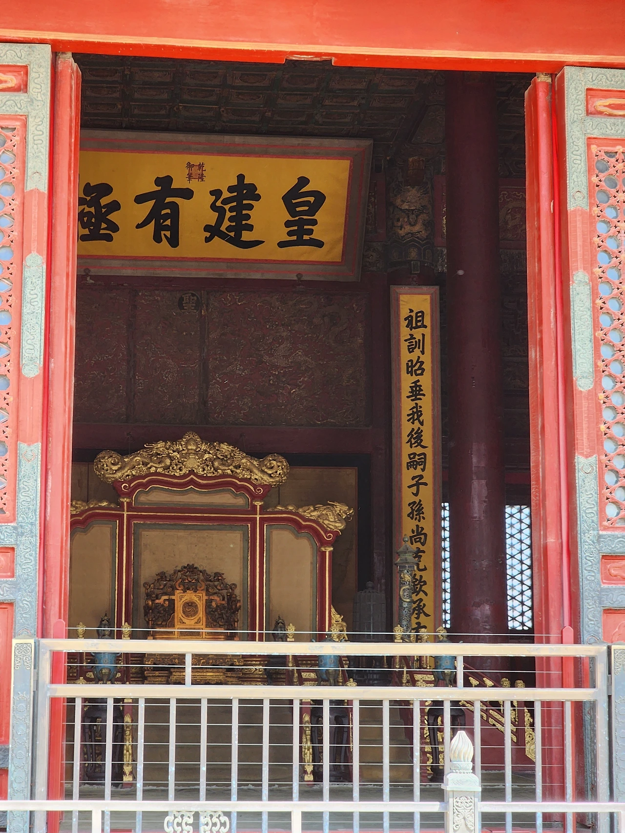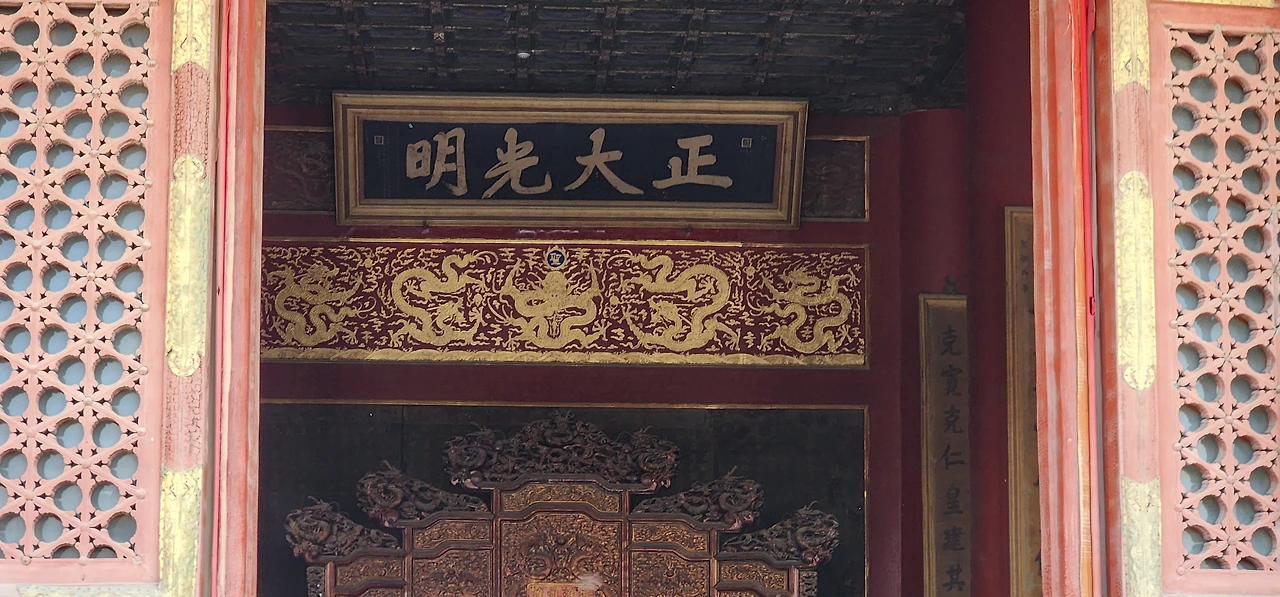 황좌 위에 청 순치제가 쓴 '정대광명(正大光明)' 액자가 걸려있는데, 황제가 자기의 후계자의 이름을 이 액자 뒤에 걸어놓는 것으로 유명하다.
